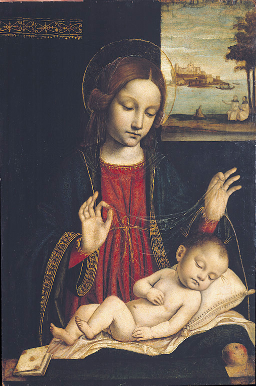 - NOTIZIE STORICO CRITICHE L'opera è passata alla Pinacoteca di Brera nel 1911 ed è oggi considerata uno dei capolavori nella produzione di piccolo formato del Bergognone. Il paese sullo "sfondo" è stato riconosciuto nel Santuario di Santa Maria a Mare delle isole Tremiti. Per l'acquisto dell'opera cfr. Soprint. BAS Archivio Antico, parte II cassetto 5/5. L'opera in origine si trovava probabilmente nella certosa di Pavia, come lascia supporre la presenza sullo sfondo di due monaci certosini. La tavola è vicina ad altre opere del Bergognone, per esempio la 'Madonna con Bambino benedicente' (Milano, collezione Gallarati Scotti) e la 'Madonna con Bambino (Milano, Museo Poldi Pezzoli). La composizione è quella tipica della pittura lombarda degli inizi del secolo XVI e fu particolarmente cara ai leonardeschi. Il velo, su cui è adagiato il Bambino, fa riferimento alla Passione di Cristo e al sudario, secondo un'iconografia che fa riferimento alle meditazioni dello Pseudo Bonaventura (Steimberg 1983, pp. 31-32). Una variante del dipinto è conservata in collezione privata: minime sono le varianti compositive dei due dipinti (nella tavoletta ora in collezione privata, diversa è la disposizione degli oggetti sul parapetto; il Gesù Bambino regge nella mano destra alcune ciliegie; il panneggio del manto della Madonna è più fitto e il lenzuolino su cui è adagiato il Bambino è giallo); completamente diverso è invece il paesaggio: nella tavoletta ora in collezione privata è rappresentata una veduta panoramica della Certosa, mentre nella tavoletta braidense è raffigurato un paesaggio insulare