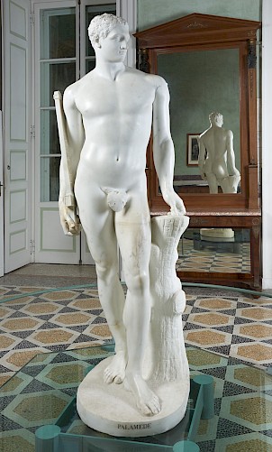 - NOTIZIE STORICO CRITICHE Il Palamede è la prima di una serie di importanti statue commissionate da Giovan Battista Sommariva al maggiore scultore dei suoi tempi, Antonio Canova. Da sempre considerata uno dei capolavori della collezione Sommariva e del museo di Villa Carlotta, il Palamede giunse a Tremezzo nel 1819 e fu collocato in una sala appositamente attrezzata con una quinta di specchi per esaltarne l'assoluta perfezione formale anche nella parte posteriore, con un effetto che è stato ripristinato nell'attuale allestimento. Canova realizzò la scultura nel suo studio di Roma nel 1803-1804 ma a causa dei danni provocati da un'inondazione del Tevere nel 1805 la statua cadde dal suo basamento di legno rompendosi in più punti e rischiando di ferire seriamente lo stesso Canova. Alla luce dei danni subiti dall'opera, Sommariva chiese un parziale risarcimento del prezzo già pagato, ricevendo un netto diniego da parte dello scultore: "Canova non ribassa i prezzi. Farà un'altra statua", fu la sua risposta. Temendo i tempi lunghi richiesti dall'esecuzione di una nuova statua Sommariva accettò che Canova restaurasse il Palamede, con un intervento "di sutura" i cui segni sono riconoscibili soprattutto sul braccio destro e sulla coscia sinistra. Il soggetto del Palamede dovette apparire particolarmente significativo a Sommariva, che poteva accostare la propria sfortuna politica presso il regime napoleonico alle vicende dell'eroe greco vittima innocente delle calunnie di Ulisse. La morte dell'eroe, cui si attribuiva l'invenzione di alcune lettere dell'alfabeto e del gioco dei dadi e degli scacchi, fu provocata da una falsa accusa di tradimento a favore dei Troiani mossa da Ulisse per vendicarsi del fatto che Palamede fosse riuscito a smascherare la follia da lui simulata per non prendere parte alla guerra di Troia. Nella sua statua Canova celebra la bellezza ideale del giovane eroe, accompagnandola con attributi iconografici collegati alle invezioni a lui attribuite dal mito: le lettere greche, che vediamo incise sul fodero della corta spada (parazonio) retto nella mano destra, e una coppia di dati, ora perduta, collocata nella mano sinistra