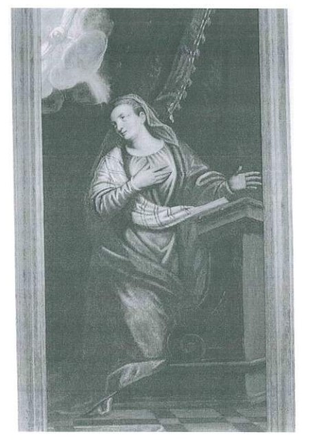 Tela dipinta ad olio raffigurante la Vergine Annunciata. Al centro della scena vi è la Madonna, appoggiata ad un inginocchiatoio posto sulla destra. In alto a sinistra vi è la colomba bianca dello Spirito Santo circondata da nuvole bianche. Sullo sfondo è visibile il lembo di un tendaggio che scende alle spalle della Madonna in senso obliquo, da destra verso sinistra