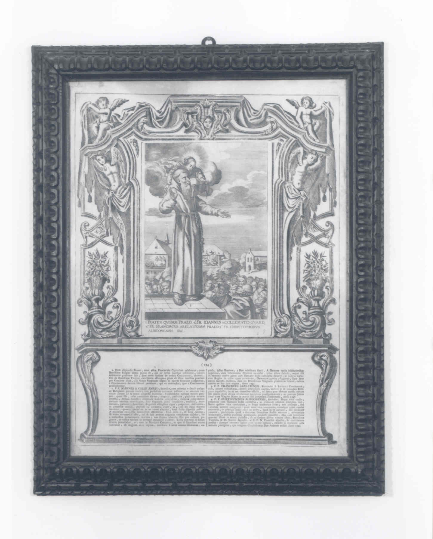 - NOTIZIE STORICO CRITICHE Opera che fa parte di una serie di incisioni: su ogni stampa è raffigurato un frate cappuccino, la cui vita, raccontata nella lunga biografia sottostante, è stata particolarmente esemplare. Cornice in legno intagliato: h 71 x l 55.5. Numero di serie 194. In deposito presso il caveau di Palazzo Kramer. Nuovo codice di archiviazione APCL 1851 (cfr. Allegato D al decreto di vincolo)