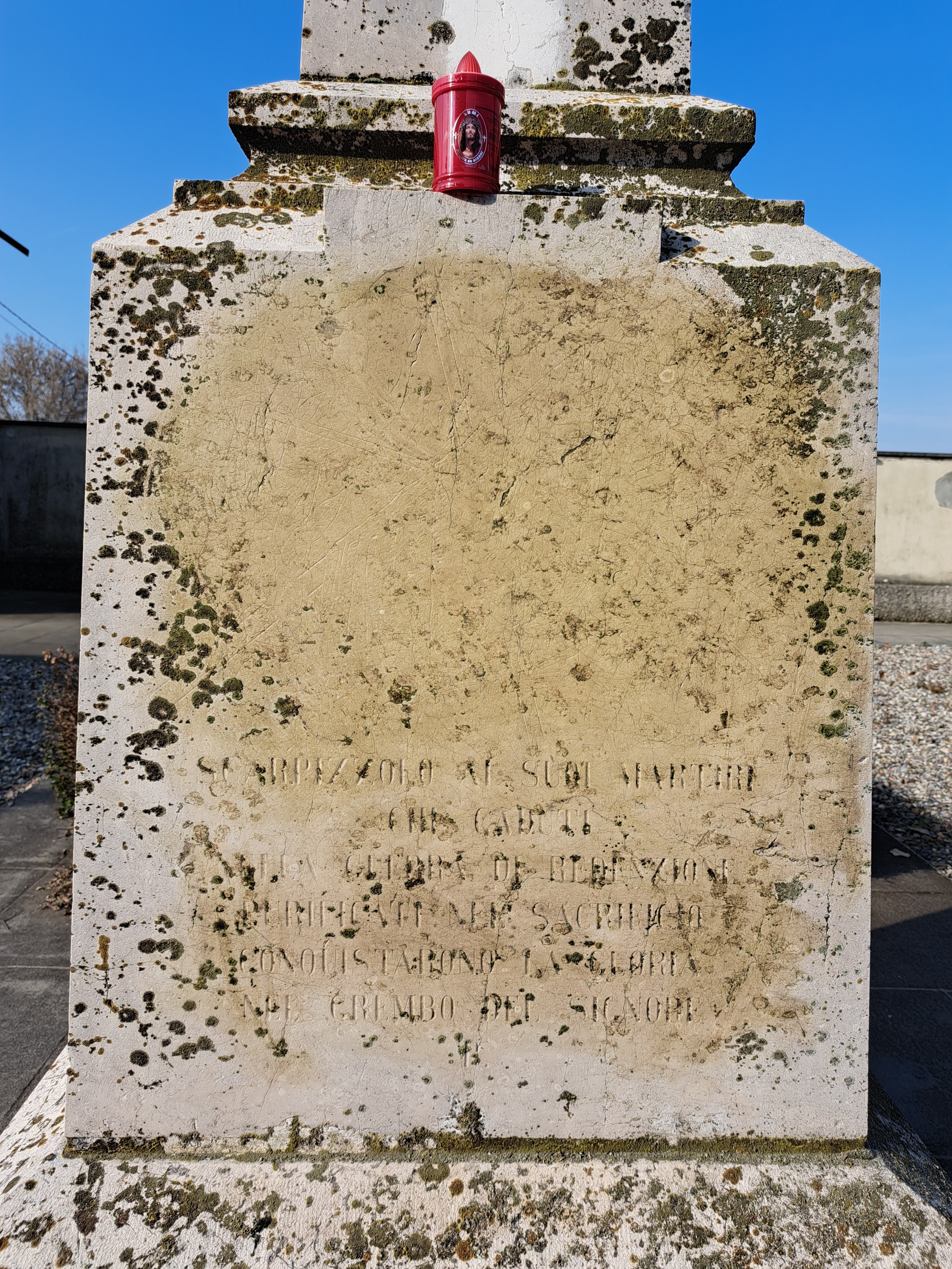 - ISCRIZIONI frontale, in basso - SCARPIZZOLO AI SUOI MARTIRI / CHE CADUTI / NELLA GUERRA DI REDENZIONE / PURIFICATI NEL SACRIFICIO / CONQUISTARONO LA GLORIA / NEL GREMBO DEL SIGNORE / P. // - capitale -