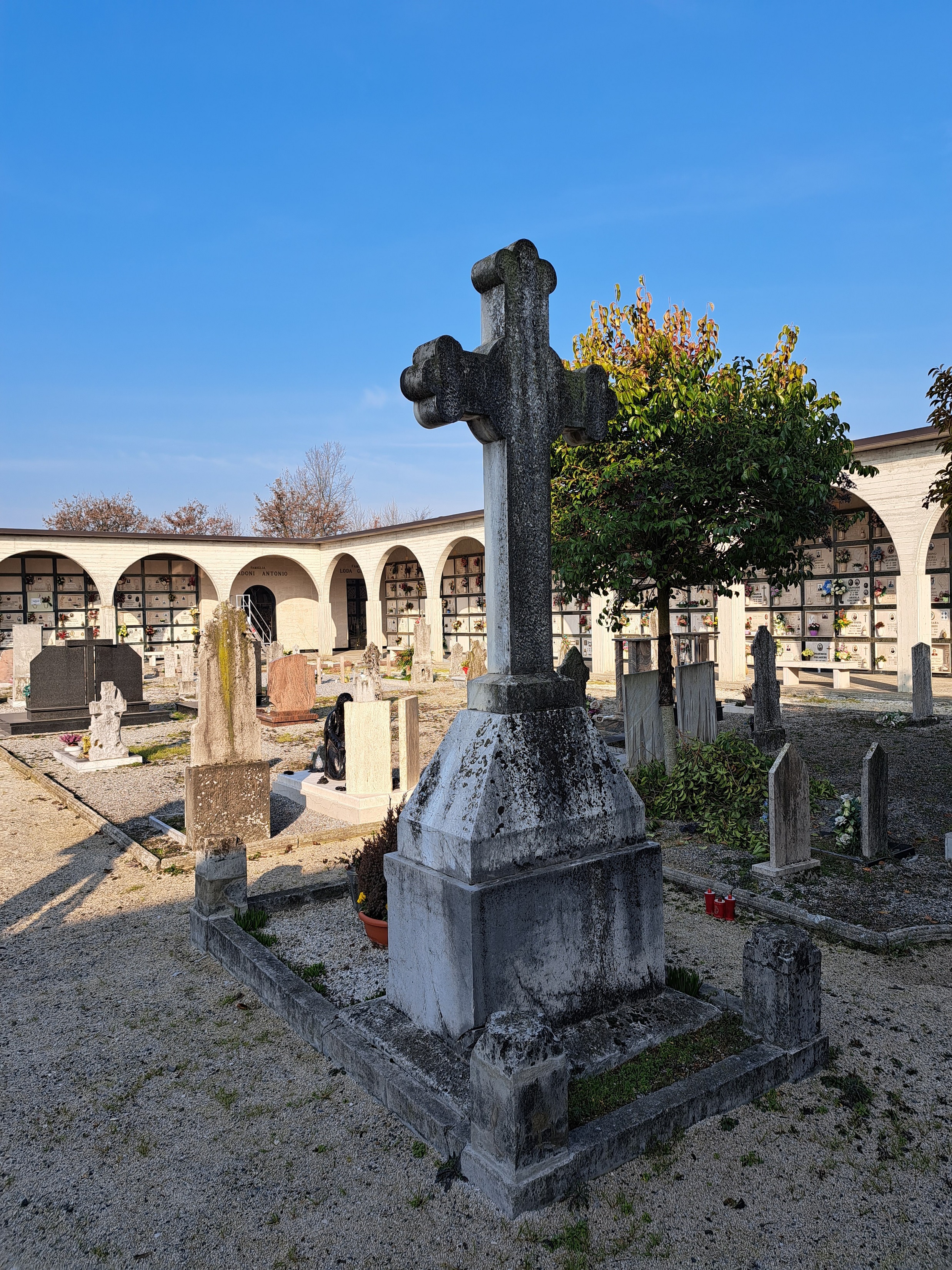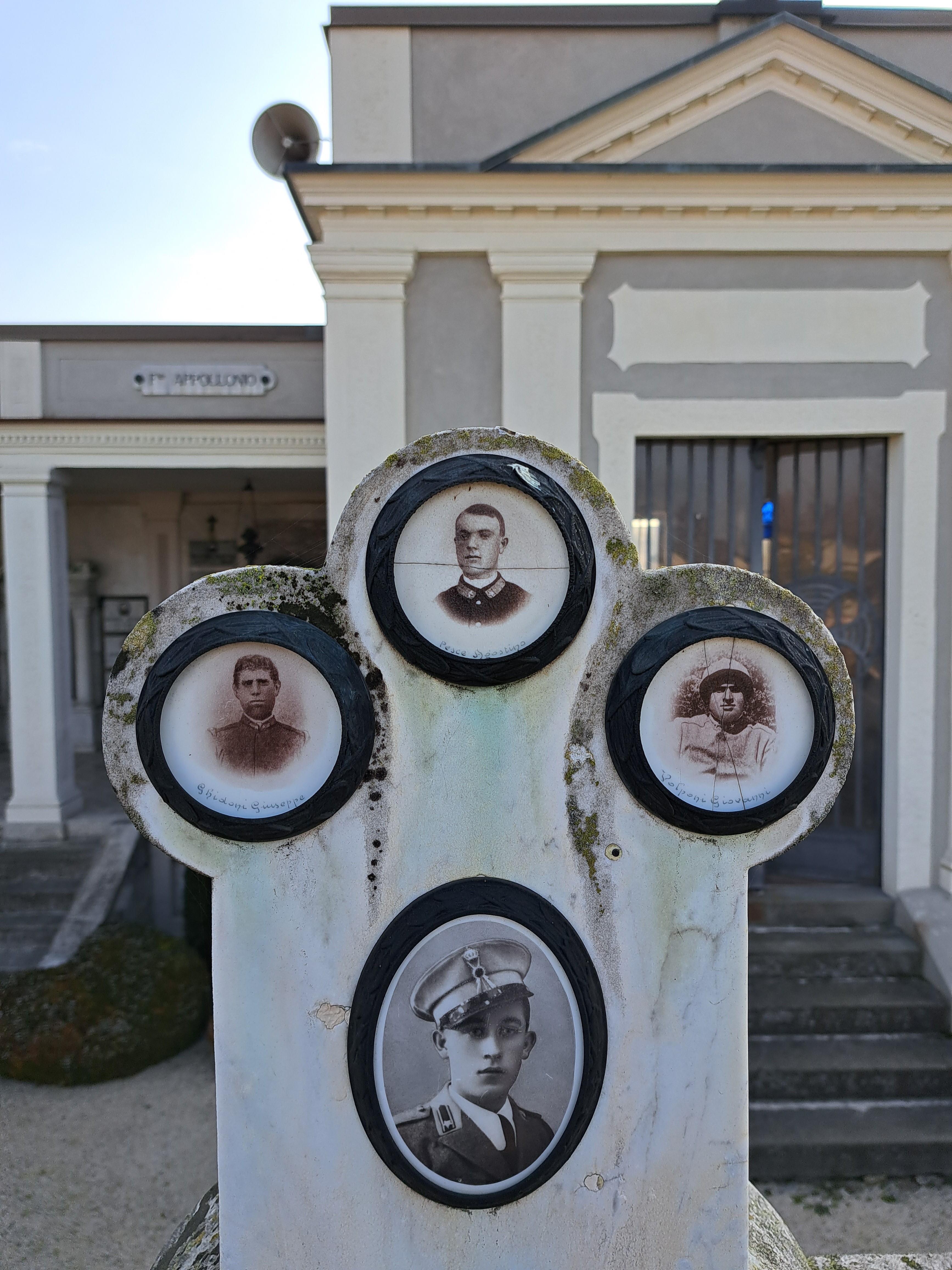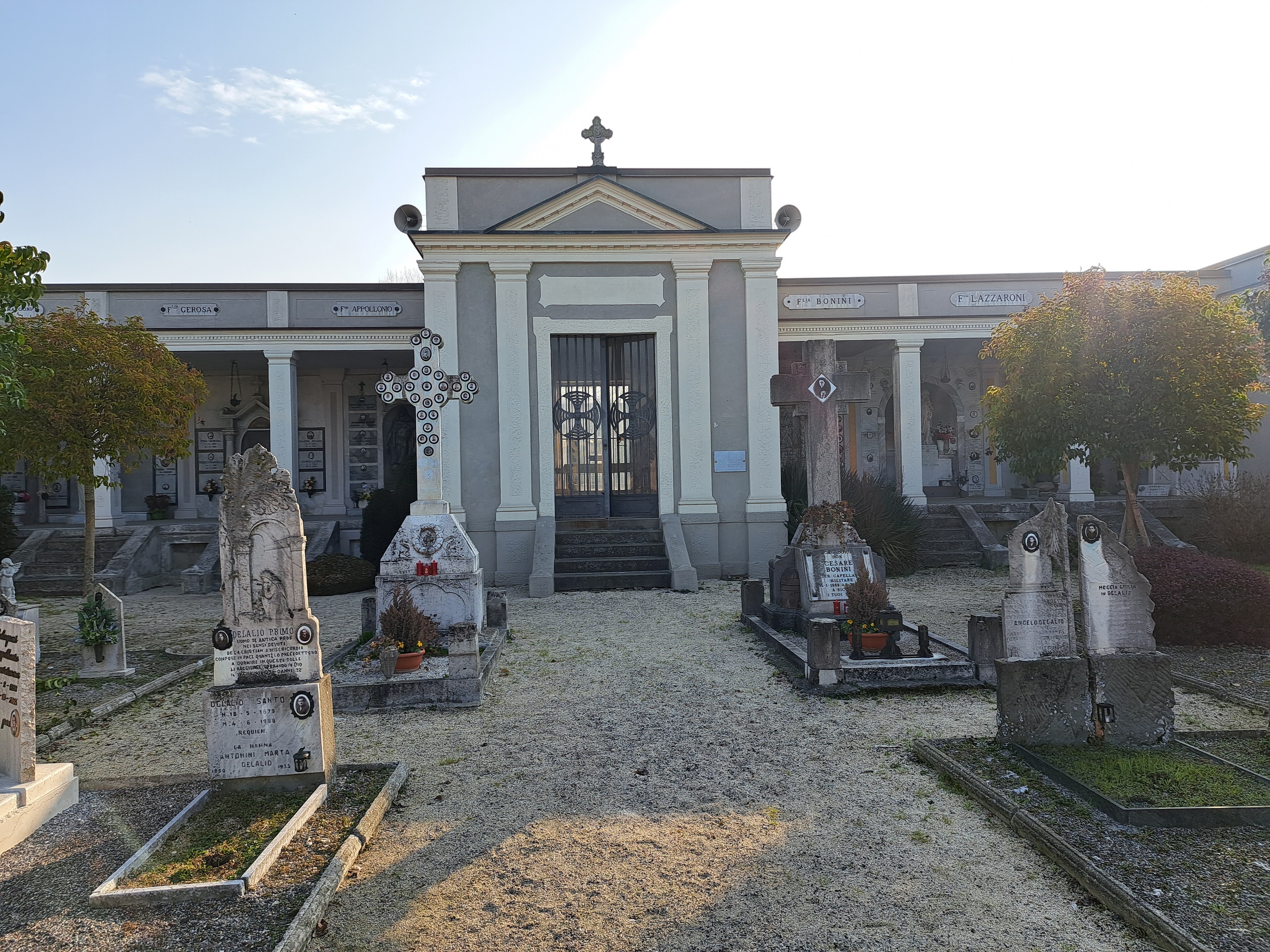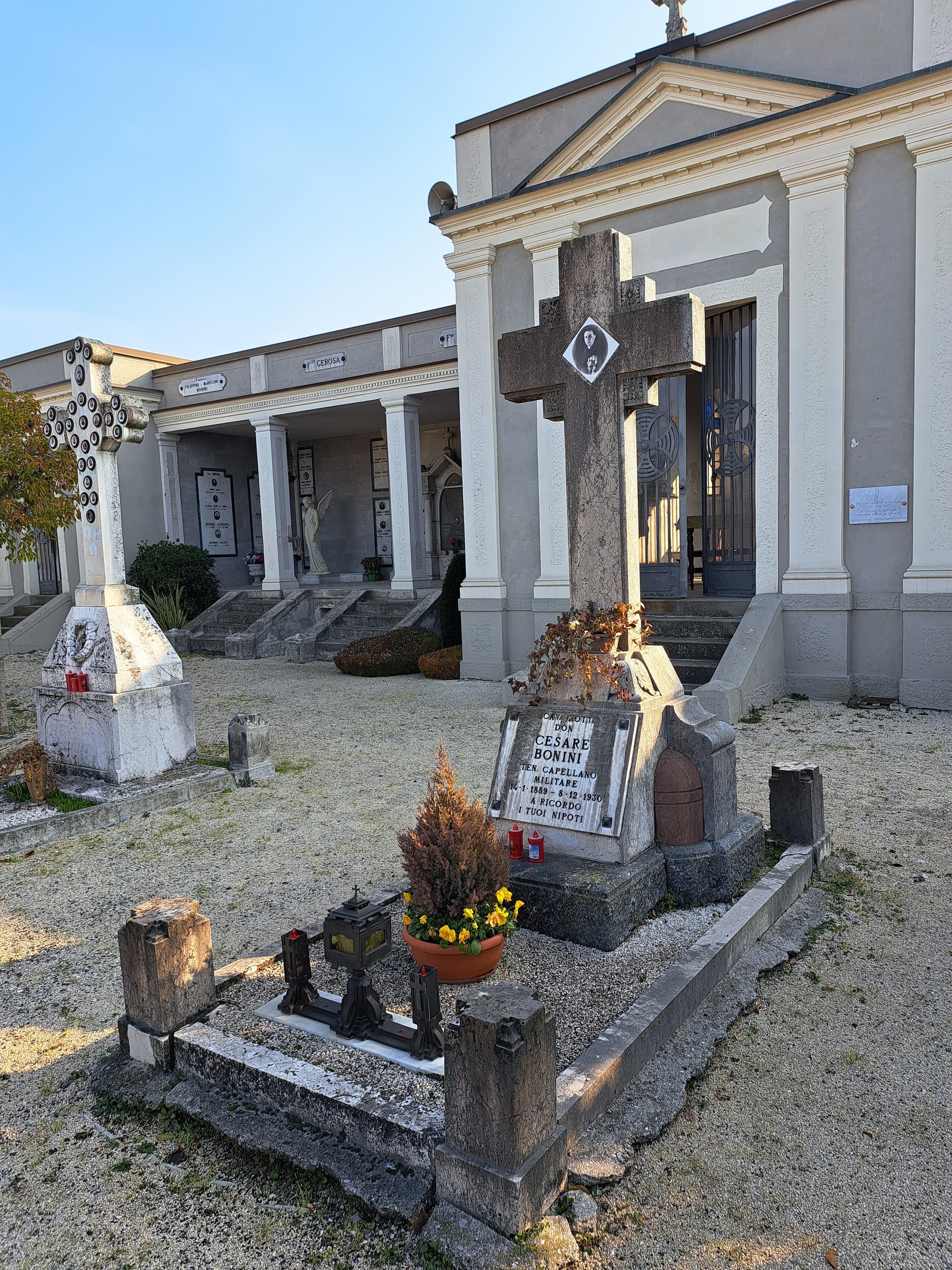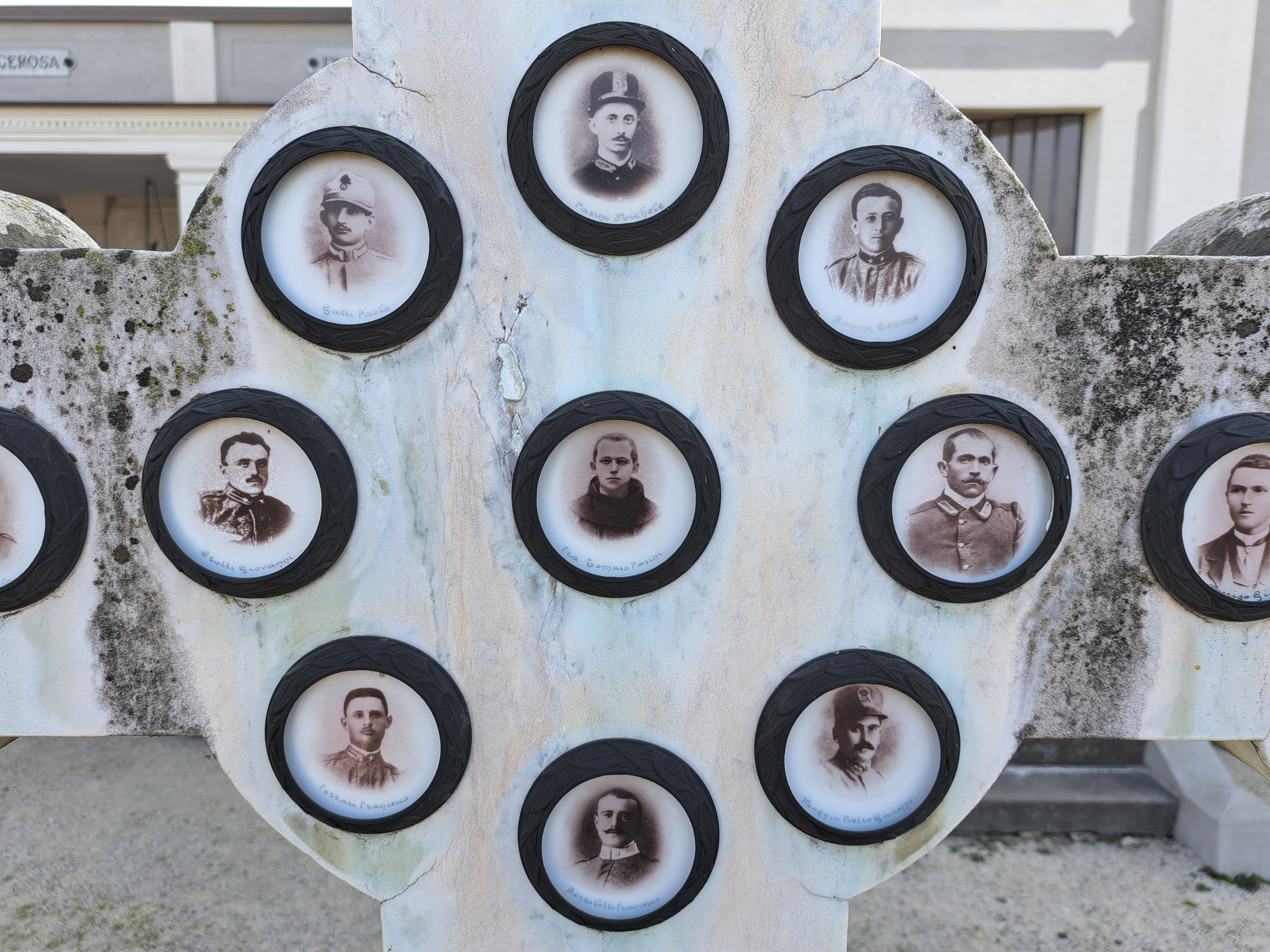 - NOTIZIE STORICO CRITICHE Pedergnaga già aveva un monumento ai propri morti, inaugurato nell'autunno del 1920 (cfr. specifica scheda di catalogo). Però, questo borgo, al pari d'innumerevoli altri in tutto il Bresciano e come testimonia altresì questa campagna di catalogazione, voleva un ricordo anche nel cimitero, perché questo luogo era ritenuto il punto di contatto fra la dimensione terrena dei vivi e quella ultraterrena, mistica dei morti. Così, a 2 anni da quello "ufficiale", sorse un secondo monumento per opera di un non meglio identificato marmista Biaggio di Pontevico, e per volontà dei famigliari dei morti, che vollero letteralmente tappezzare la grande croce con le fotografie dei propri cari, tutti in quella divisa grigioverde che fu il loro ultimo sudario. Oltre che per la struttura davvero inconsueta, la quale lo rende una sorta di barocchismo del dolore - eppur così umano -, questo manufatto, da un punto di vista socio-antropologico, è notevole anche per l'epigrafe. Essa è a-patriottica, ma non in senso contestatario; piuttosto da quelle parole emerge l'atemporale, ancestrale rapporto fra l'Uomo e la Morte, qui declinato nell'interpretazione cristiana del grande mistero. I predetti vari fattori, rendono questo manufatto uno fra i più singolari, e toccanti, di quelli analizzati nel corso di questa campagna di catalogazione. Quando don Cesare Bonini, già soldato di sanità encomiato alla fronte Giulia, poi cappellano militare in fanteria e addetto per 4 anni al riordino dei cimiteri di guerra, che fu l'oratore in decine d'inaugurazioni di lapidi/monumenti nel Bresciano, si spense nel 1930 a soli 40 anni, le sue spoglie furono tumulate nel cimitero avito. La sua tomba affiancava e richiamava, anche nella foggia, quell'intimistico ricordo sorto 8 anni addietro. Fonti e bibliografia: Da Pedergnaga, "Il Cittadino di Brescia", 7-11-1922; C. Bonini. Alla guerra. Dal mio diario di cappellano militare, La Scuola, Brescia 1928; E. Cerutti, Bresciani alla Grande guerra. Una storia nazionale, FrancoAngeli, Milano 2017