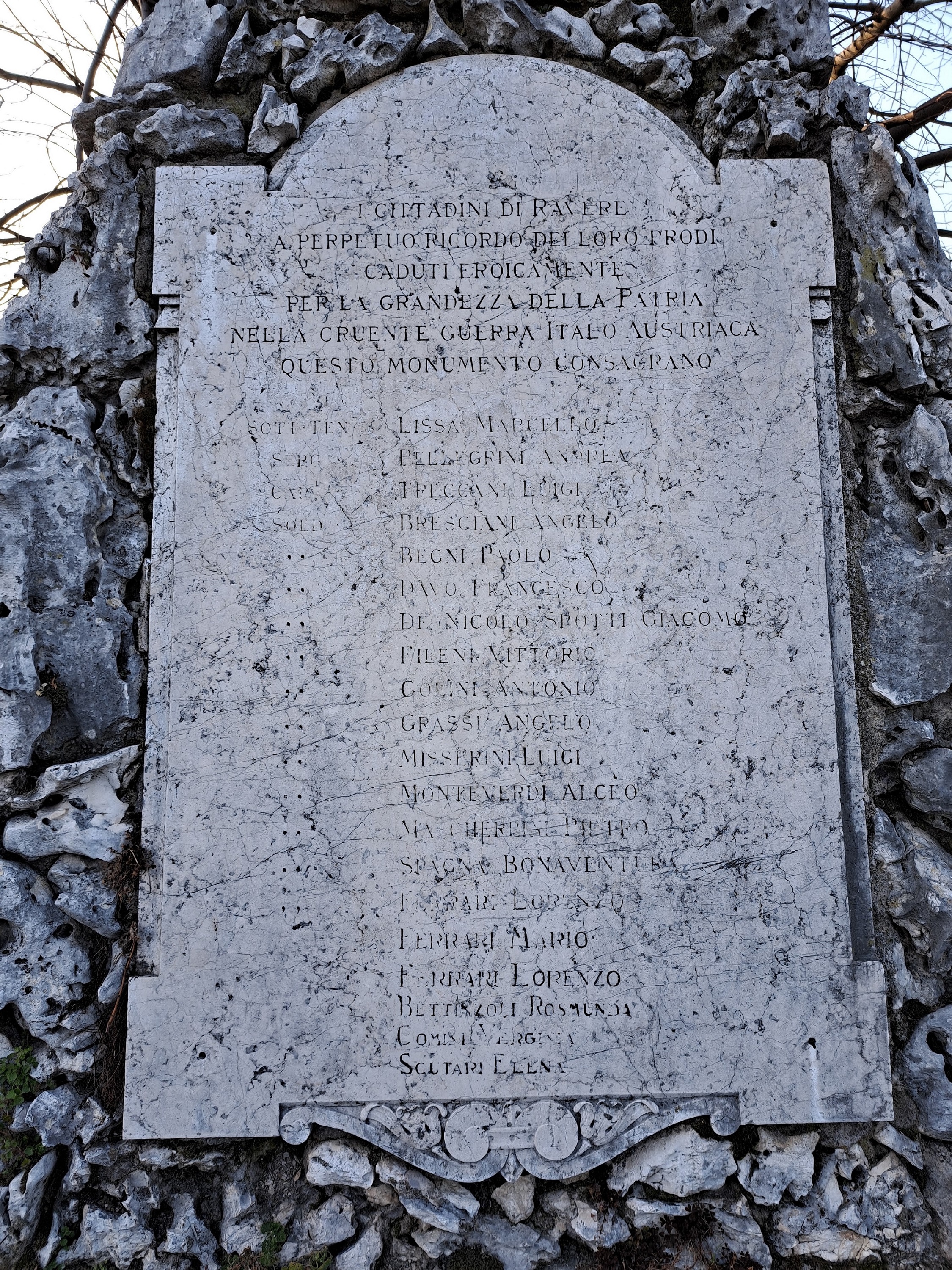 - ISCRIZIONI frontale, al centro - I CITTADINI DI RAVERE / A PERPETUO RICORDO DEI LORO PRODI / CADUTI EROICAMENTE / PER LA GRANDEZZA DELLA PATRIA / NELLA CRUENTA GUERRA ITALO AUSTRIACA / QUESTO MONUMENTO CONSACRANO // SOTT. TEN. LISSA MARCELLO / SERG. PELLEGRINI ANDREA / CAP.LE TRECCANI LUIGI / SOLD. BRESCIANI ANGELO / “ BEGNI PAOLO / “ DAVO FRANCESCO / “ DE NICOLÒ SPOTTI GIACOMO / “ FILENI VITTORIO / “ GOLINI ANTONIO / “ GRASSI ANGELO / “ MISSERINI LUIGI / “ MONTEVERDI ALCEO / “ MASCHERRINI PIETRO / “ SPAGNA BONAVENTURA / “ FERRARI LORENZO / FERRARI MARIO / FERRARI LORENZO / BETTINZOLI ROSMUNDA / COMINI VIRGINIA / SCUTARI ELENA // - Perini cav. Antonio - capitale -