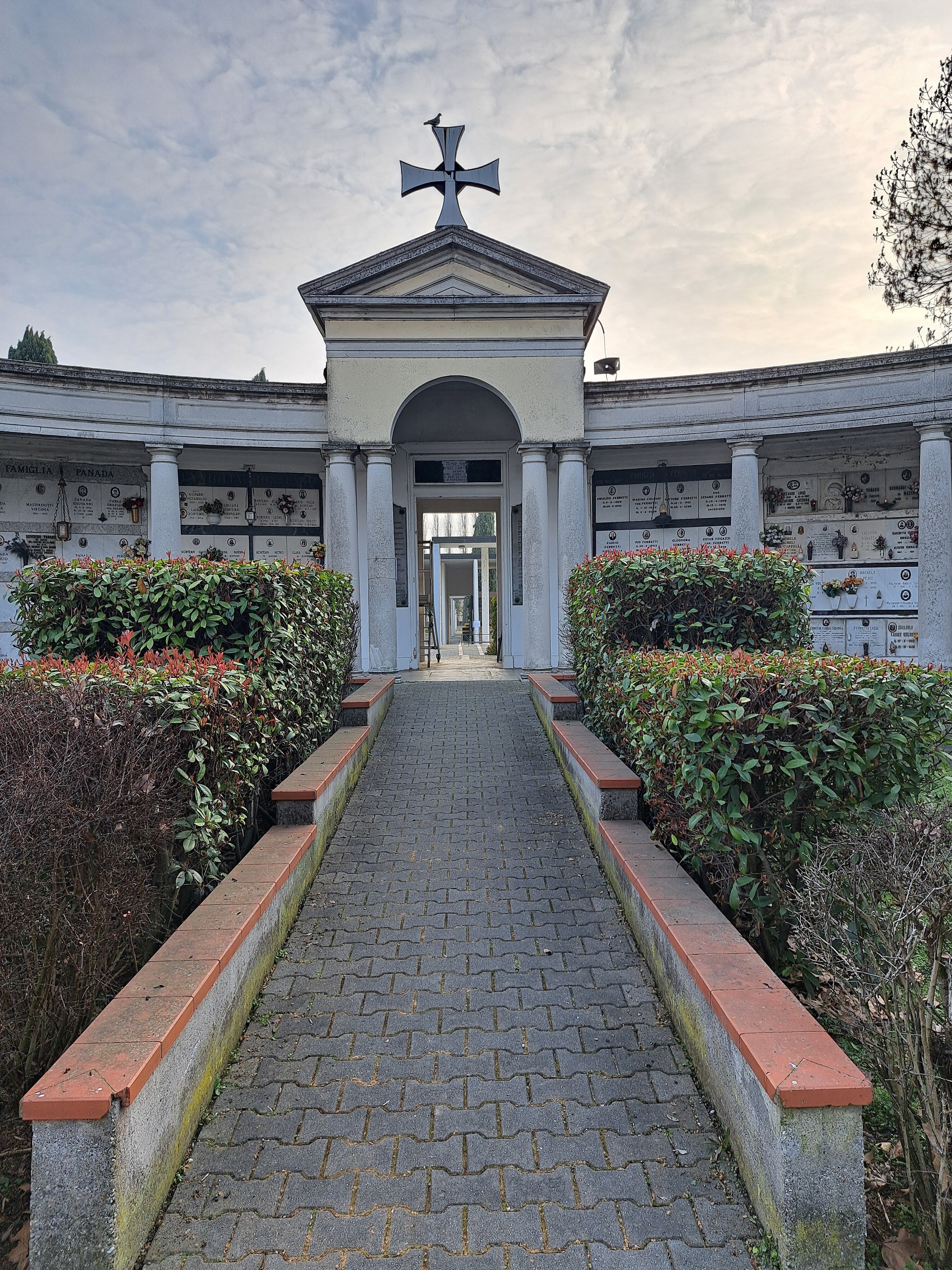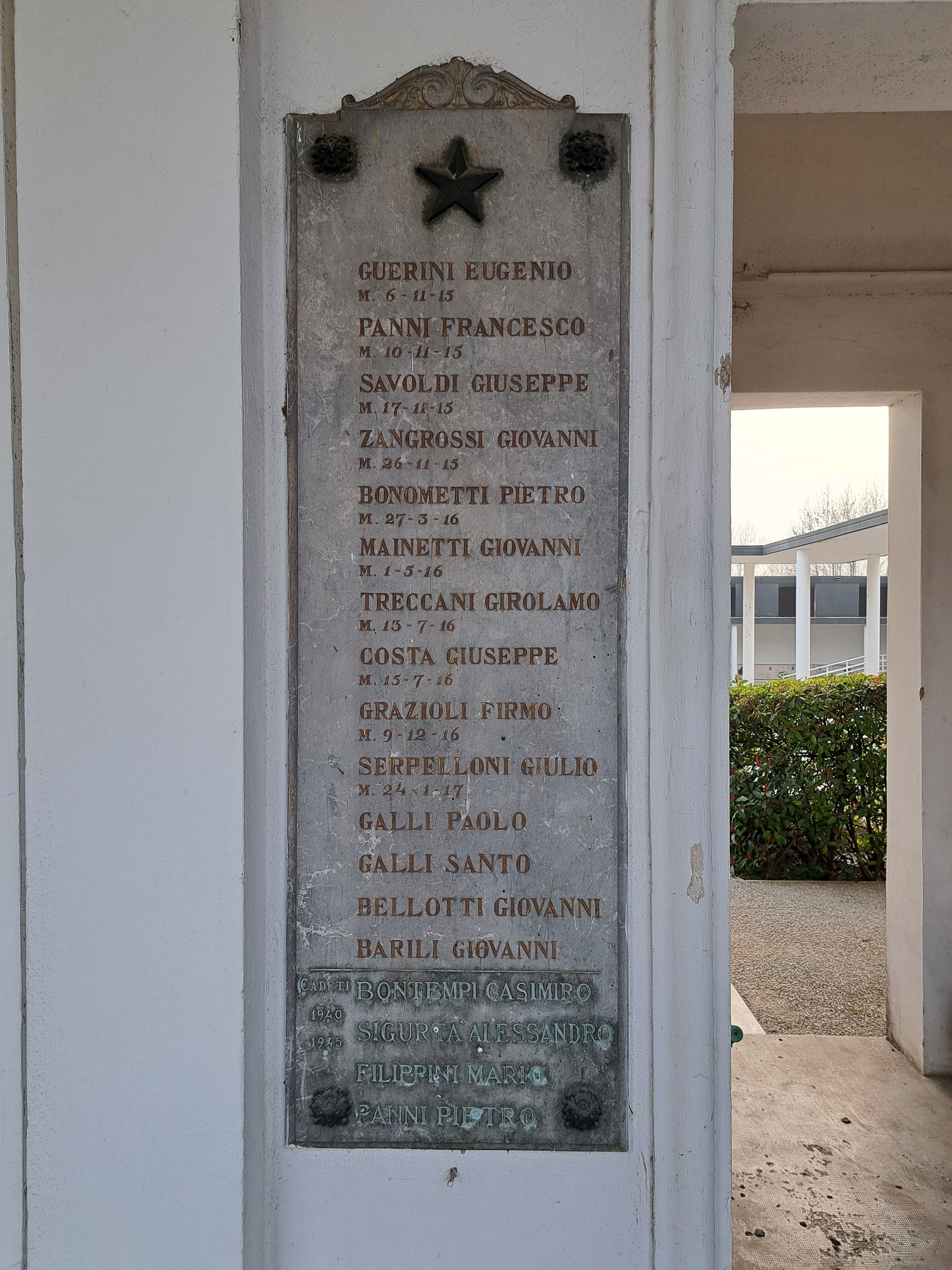 - NOTIZIE STORICO CRITICHE San Zeno Naviglio già nel marzo del 1920 aveva inaugurato una lapide ai propri morti in guerra. Essa era stata murata nella facciata municipio, ma probabilmente non nella posizione in cui è oggi. Oratore ufficiale fu l’on. Carlo Bonardi. L’esecutore del ricordo, a giudicare dalla sua conformazione quasi identica ad altre lapidi da essa prodotte, avrebbe potuto essere la Ditta Bonifacio (la lapide oggi è mancante del lobo in basso a destra, su cui era di solito apposta la firma). Nella cronaca di quella cerimonia, però, non vi è cenno alcuno al lapidario del cimitero. Pertanto, si deve dedurre che esso fu successivo. In un conciso resoconto della cerimonia del 4 novembre 1931, si apprende che nel cimitero di S. Zeno vi era una cappella dedicata ai morti nella Grande guerra. Per la sintesi, nella cronaca non si fa cenno al lapidario, ma esso dovrebbe risalire a quando vi fu la dedicazione ai caduti. E’ da segnalare, sull’epigrafe dedicatoria, il riferimento esplicito al 1915-1918 come “guerra d’indipendenza”. Dopo il 1945 furono aggiunti negli spazi vuoti delle 2 lapidi alcuni dei deceduti nel conflitto 1940-1945, specie morti nella fase finale del conflitto. Sfugge il criterio della scelta di questi 8 sul totale dei 28 che, invece, furono poi commemorati in modo più preciso su un’altra lapide specifica, oggi collocata presso il monumento ultra-moderno ai morti nelle guerre posto nella piazza del municipio; quantomeno il manufatto originario non fu più oltre intaccato. Sempre dopo il 1945, il muro posteriore della cappella fu abbattuto per creare un passaggio con la parte nuova del camposanto, che ha un suo ingresso principale. Sicché la parte vecchia del cimitero non è frequentata dai più; stato di abbandono che contribuisce al fascino di questo lapidario policromo. Fonti e bibliografia: Da S. Zeno Naviglio. La lapide ai caduti e la bandiera ai combattenti, “La Sentinella Bresciana”, 3-3-1920; S. Zeno Naviglio, “Il Popolo di Brescia”, 7-11-1931