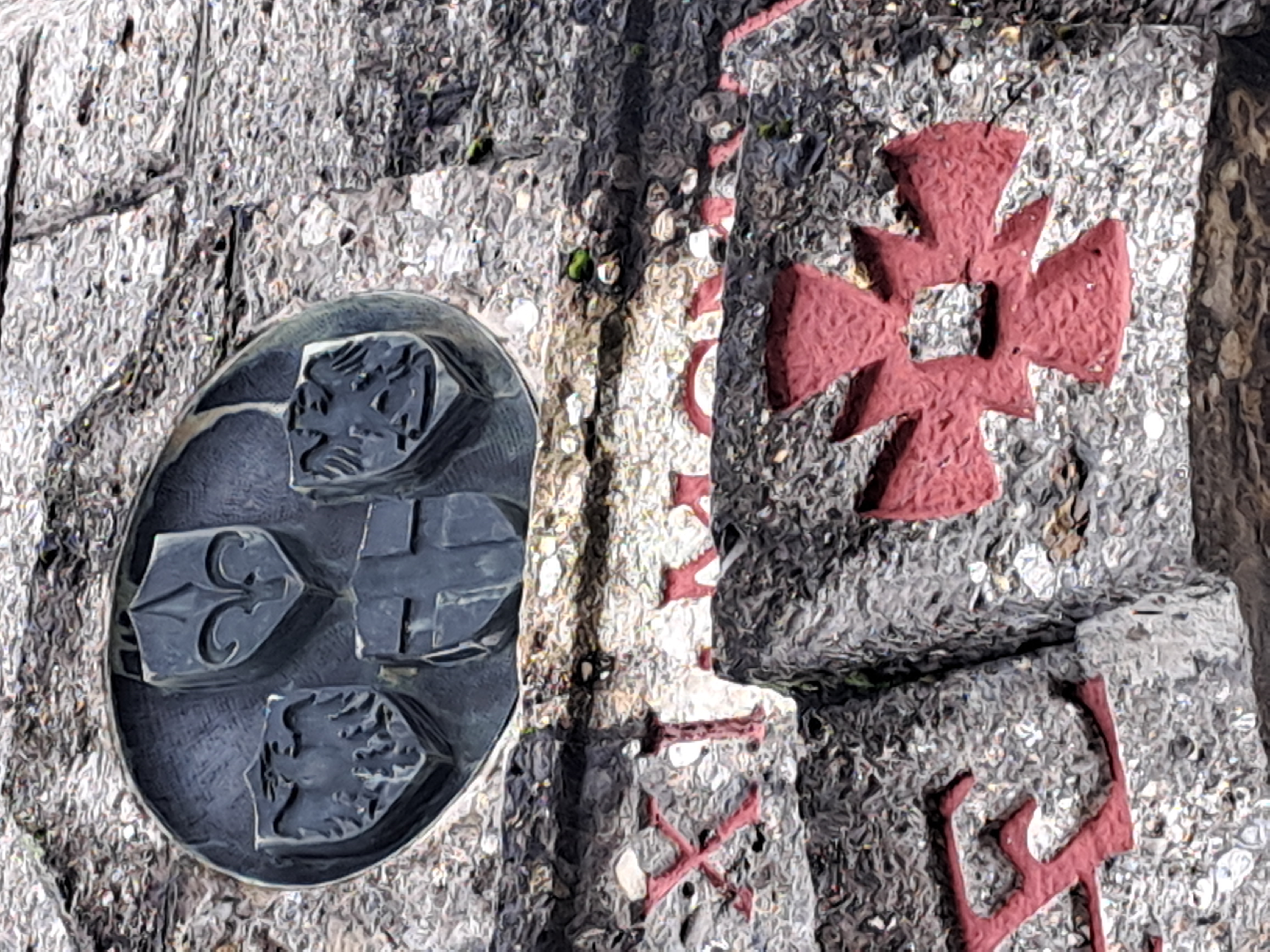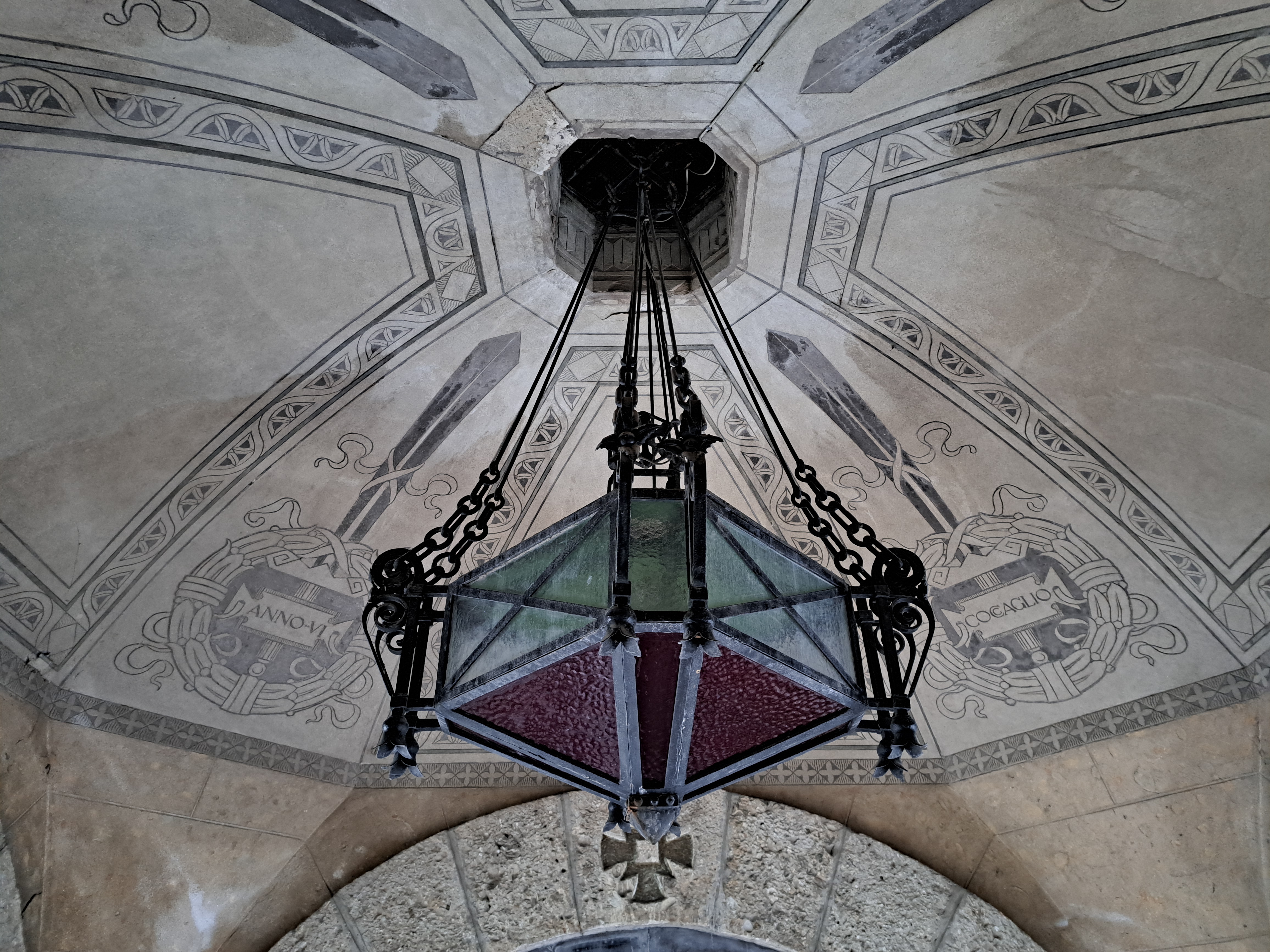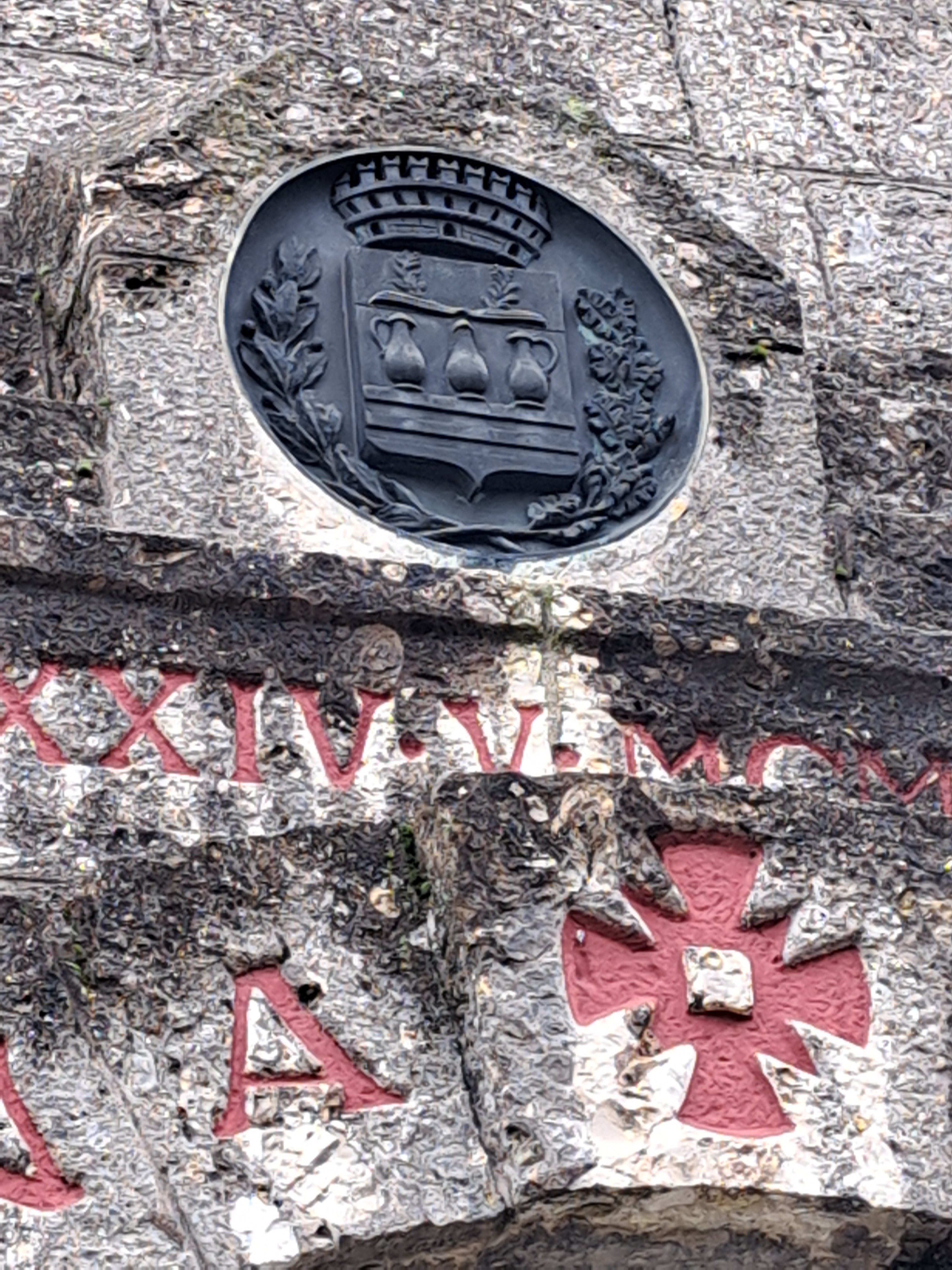 - STEMMI inciso nella cappella interna; fuso ne bronzo, tondo esterno a sinistra - civile - Stemma - Stemma del Comune di Trento - 2 - Scudo troncato: nel primo d'azzurro a due boccali e una bottiglia di coccio rosso al naturale, posti sulla troncatura; nel secondo d'argento a due fasce di azzurro