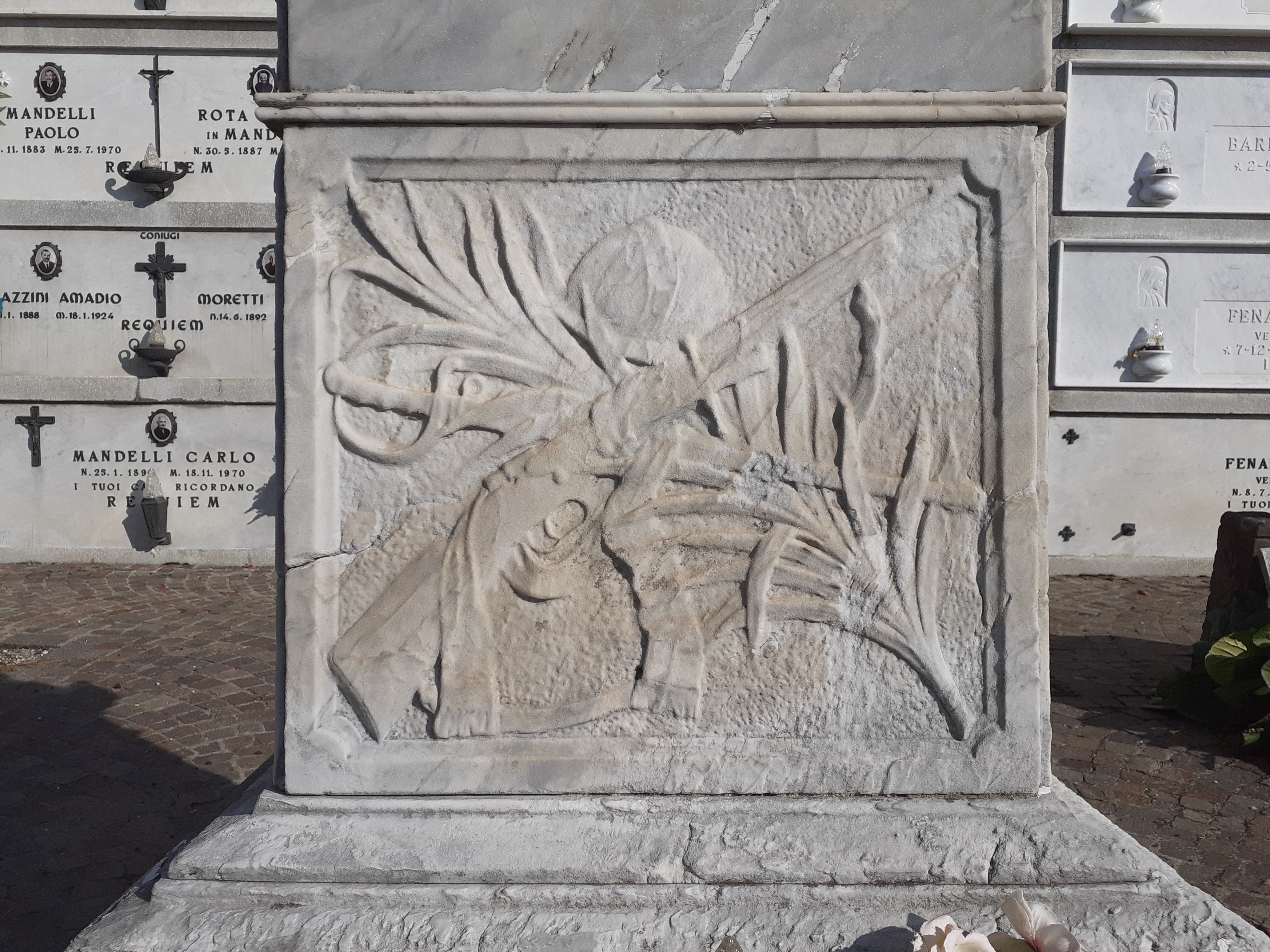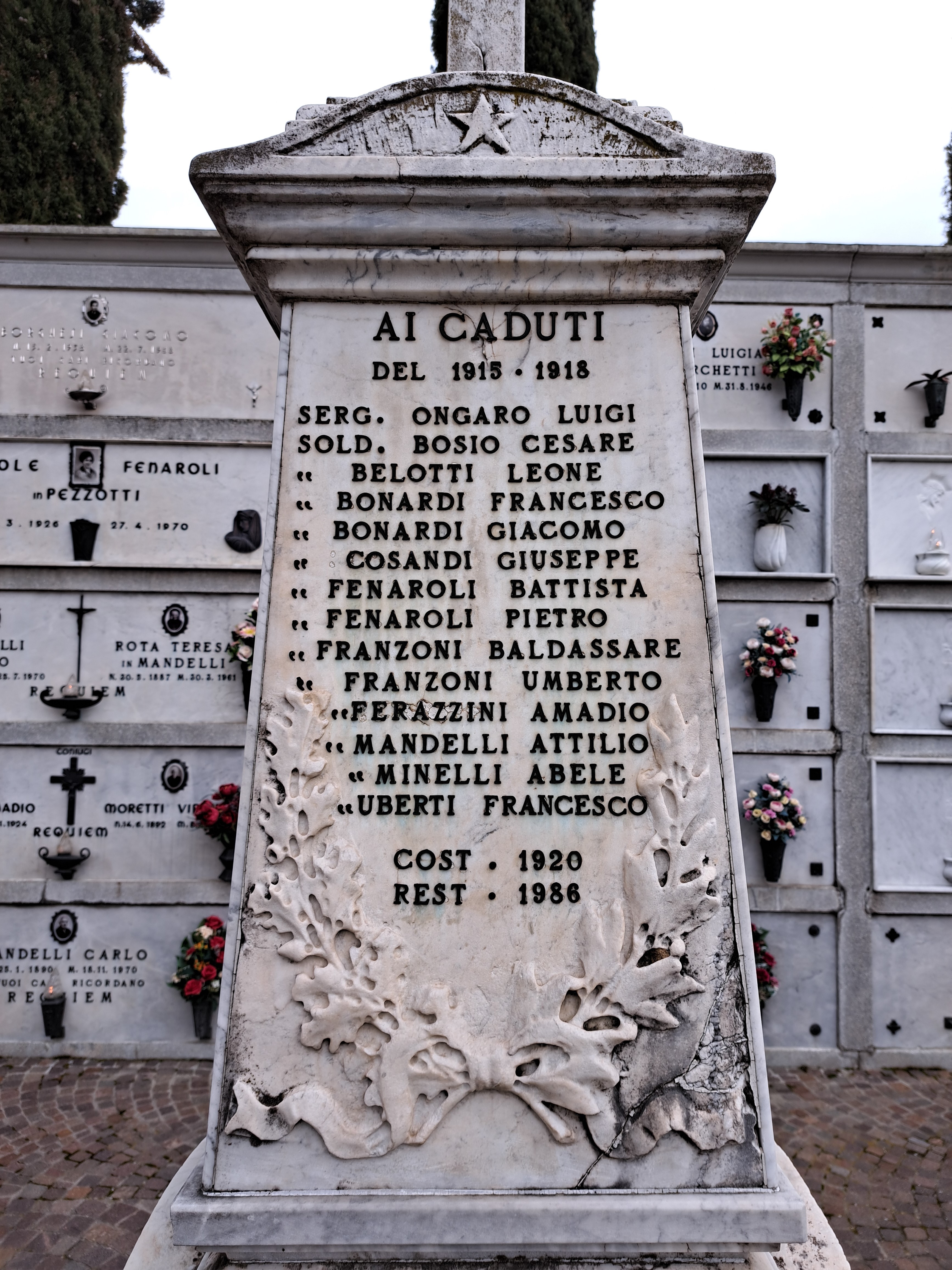 - ISCRIZIONI frontale, in alto - AI CADUTI / DEL 1915-1918 // SERG. ONGARO LUIGI / SOLD. BOSIO CESARE / " BELOTTI LEONE / " BONARDI FRANCESCO / " BONARDI GIACOMO / " COSANDI GIUSEPPE / " FENAROLI BATTISTA / " FENAROLI PIETRO / " FRANZONI BALDASSARRE / " FRANZONI UMBERTO / " FERAZZINI AMADIO / " MANDELLI ATTILIO / " MINELLI ABELE / " UBERTI FRANCESCO // COST . 1920 / REST . 1986 // - capitale -