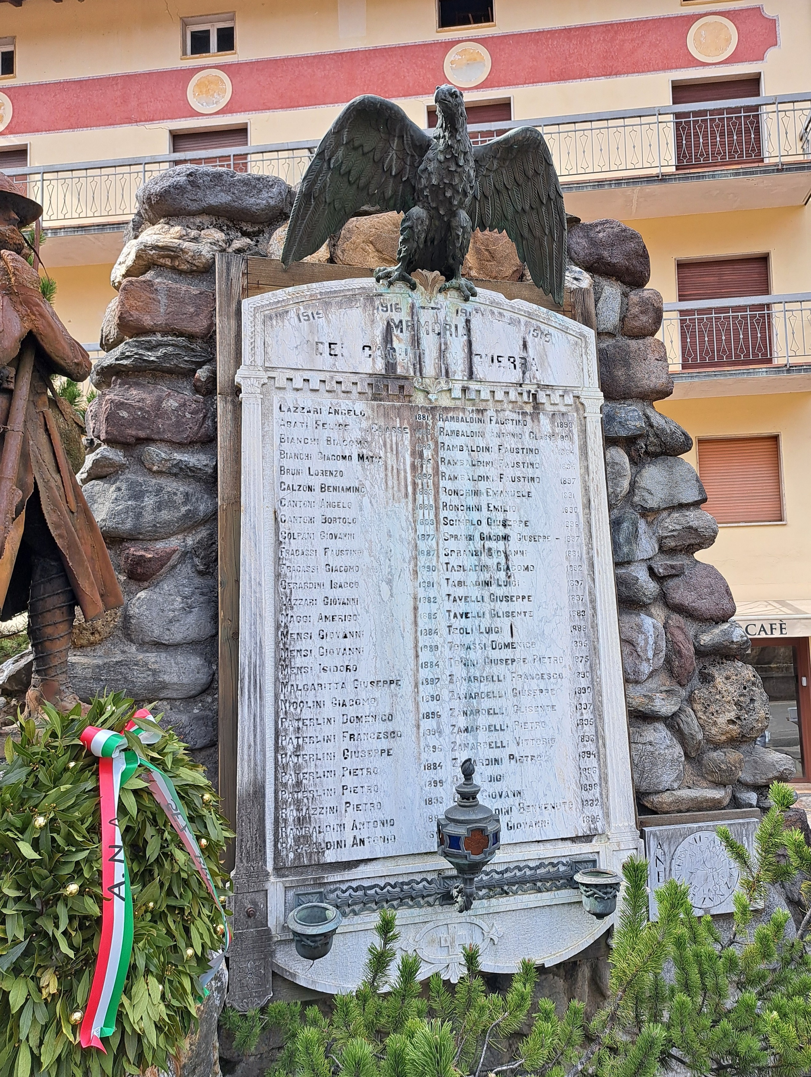 Il monumento sorge nella piazza principale del paese e, oggi, è composto da 2 stele su cui sono fissate 2 grandi e massicce lapidi marmoree. Il supporto è costituito da muri composti da massi di roccia locale, per lo più granitici, da cemento, e da spesse cornici in legno. Fra le due steli vi è la statua di un alpino, con pastrano e con il caratteristico cappello, nella divisa della guerra 1915-1918 mentre monta di vedetta. La lapide per i 54 morti nella Grande guerra (h 260 cm X 128 larghezza X 5 spessore) ha forma di rettangolo, poggiante sul lato più corto. Il lato superiore è stondato, e su di esso poggia la scultura in bronzo di un'aquila ad ali spigate. Il lato inferiore, invece, è bilobato e accoglie una croce di Cristo scolpita a bassorilievo. Al di sopra di essa vi è un fregio in bronzo con 2 contenitori per gli omaggi floreali e, nel mezzo, una lampada votiva coeva, con vetri gialli e blu. I bordi della lapide, sono decorati con fregi scolpiti a bassorilievo: i fianchi riproducono 2 sottili lesene con capitelli corinzi. La parte stondata in alto accoglie l'epigrafe dedicatoria molto semplice e concisa, persino a-patriottica. Al di sotto di essa, divisi in 2 colonne, sono riportati i deceduti in tendenziale ordine alfabetico; per ognuno è specificato: cognome, nome e anno di nascita. La lapide ai ben 60 morti nel conflitto 1940-1945, invece, è quasi speculare alla prima lapide, ma è molto più semplice e priva di qualsiasi fregio, eccetto un'aquila ad ali spiegate ma in lamina bronzea (h 210 cm X 145 larghezza X 4 spessore). Anche qui vi è una concisa epigrafe in alto, cui seguono i morti divisi in 2 colonne. Per tutti si specifica: cognome, nome e anno di nascita; ma nei casi di omonimia è precisata anche la paternità, e in 3 casi di premiati al valore è riportata anche la decorazione meritata. Anche questa lapide è dotata di una lampada votiva a luce elettrica, con vetro di colore rosso, ma è assai meno elaborata di quella dell'altra lapide. Questa stele, infine, porta applicate anche 2 piccole lapidi in ricordo del 50° della fine della seconda guerra mondiale, per cura della FIDAC e dell'ANEI