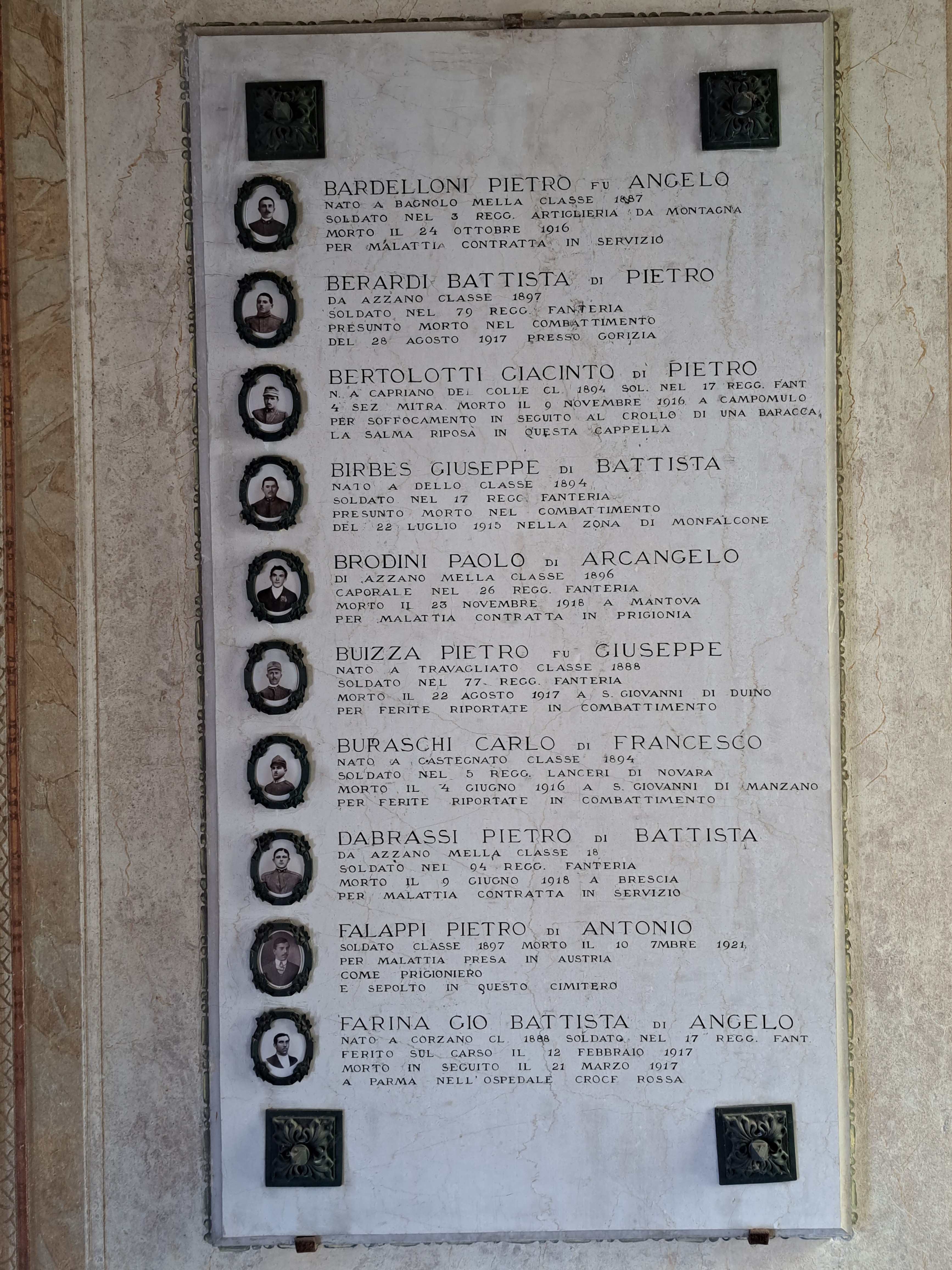 - NOTIZIE STORICO CRITICHE Ad Azzano Mella esisteva già una lapide ai morti nella Grande guerra, inaugurata nella primavera del 1919, ma di cui oggi non si è rinvenuta traccia. Era stata offerta dal sindaco, cav. Francesco Vimercati, ed era murata nella facciata del municipio. Nell'occasione dei lavori per il nuovo cimitero fu edificata una cappella espressamente dedicata ai morti nella recente guerra, affrescata da Vittorio Trainini nel 1923. La benedizione e l'inaugurazione delle nuove opere avvennero martedì 4 novembre 1924, per opera del vescovo ausiliare di Brescia, mons. Emilio Bongiorni. In quell'occasione furono anche consegnati i distintivi agli orfani di guerra e onorificenze ai famigliari dei caduti; alla sera "artistica illuminazione" e fuchi artificiali. Questa opera è rappresentativa di un fenomeno diffuso nel Bresciano nel corso degli anni Venti-Trenta del XX secolo, cioè le cappelle votive ai morti nella guerra 1915-1918 all'interno dei cimiteri. Esse sorsero anche perché tra il 1920-21 ed il 1925-26 ebbero luogo le traslazioni di salme dai campi di battaglia, dapprima a carico dei privati, poi a carico dello Stato; fenomeno interessante dal punto di vista antropologico che documenta l'evoluzione dei rapporti fra l'Uomo e la Morte. Queste cappelle servirono anche come ultima dimora per i resti dei soldati che tornavano nei cimiteri aviti. La cappella di Azzano è davvero un unicum per due aspetti. Il primo è costituito dalle ricche ed elaborate decorazioni pittoriche, opera del Trainini, che rendono quei 25 metri quadrati affatto inaspettati e alquanto suggestivi. In secondo luogo, per il lapidario ai deceduti nel conflitto 1915-1918. Esso è, in genere, il più preciso possibile nelle storie di ciascheduno. Vengono precisati persino i "riparti speciali" - come si diceva allora - quali le sezioni mitraglia, i reparti zappatori o i lancia torpedini; per un geniere e un artigliere, addirittura, è nominata la compagnia o la batteria; per alcuni si specificava persino la morte successiva al rimpatrio dalla prigionia, ma agli stenti della quale era riconducibile, mentre per altri sono assai dettagliate la causa di morte, l'unità sanitaria o la località dove avvenne il decesso. "L'acribia patriottica", che contribuiva a rendere ancor più vivide e umane le figure dei morti, si è rinvenuta anche in altri casi, quando erano specificati pure i luoghi e le date dei decessi, ma questo è l'unico caso rinvenuto a tali livelli di completezza in tutta questa campagna di catalogazione; e, pertanto, merita di essere ricordato. Fonti e bibliografia: "Il Cittadino di Brescia": Da Azzano Mella. Pel ritorno dei combattenti, 10-2-1920; A Azzano Mella. Solennità per l'inaugurazione del monumento ai Caduti, 2-11-1924; A Azzano Mella. Benedizione nel cimitero nuovo e della Cappella votiva pei Caduti, 11-11-1924