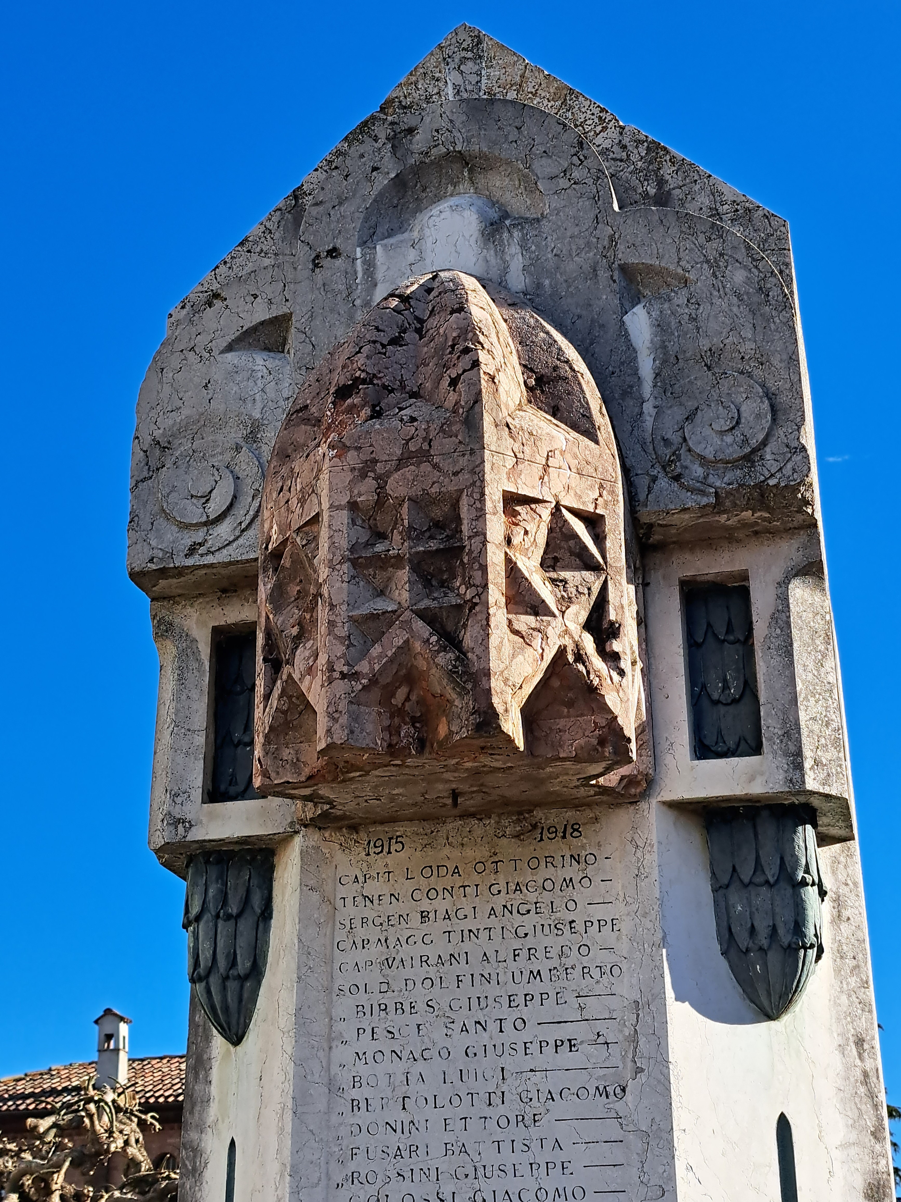 • ISCRIZIONI frontale, in alto - 1915 - 1918 / CAPIT. LODA OTTORINO - / TENEN. CONTI GIACOMO - / SERGEN. BIAGI ANGELO - / CAP. MAGG. TINTI GIUSEPPE - / CAP. VAIARINI ALFREDO - / SOLD. DOLFINI UMBERTO - / " BIRBES GIUSEPPE - / " PESCE SANTO - / " MONACO GIUSEPPE - / " BOTTA LUIGI - / " BERTOLOTTI GIACOMO - / " DONINI ETTORE - / " FUSARI BATTISTA - / " ROSSINI GIUSEPPE -/ " COLOSSI GIACOMO - / " ODOLINI GIOVANNI - / " CARERA GIUSEPPE - / " GIACOBBI GIOVANNI - / " SOSSI GIUSEPPE - / " DOLFINI GIUSEPPE - / " CARERA FRANCESCO - / " ODOLINI GIACOMO - / " BELLI BERNARDO - / " PAITONI GIOVANNI - / " MERIGO BATTISTA - / " ROSSINI SANTO - / " ZANDOLINI LORENZO - / " BERTOLOTTI GIUSEPPE - / " CAROLI BATTISTA - / " BARONIO AGOSTINO // 1940 - 1945 / T.COL. AGOSTI GUIDO MEDAGLIA D'ORO / CAP. LECORI LUIGI / SOLD. PESCINI ANGELO / PESCI ENRICO / REGROSI GIACOMO / MONFARDINI DANTE / TIRELLI CARLO / DISPERSI / SERG.MAGG. PRANDELLI CARLO / CAP. FERRARI PIETRO / SOLD. CHIARI ANTONIO / DONINI CARLO / SOLD. FERRARI VITTORIO / ZANDONINI GIOVANNI / MARCHIONI GIUSEPPE / TOMASONI GIOVANNI / ROCCA DAVIDE / FAVALLI MARIO / BOTTA PIETRO / GUARNERI ANGELO / BELLETTI GIUSEPPE / FERRARI GUIDO / PESCINI GIOVANNI / BENDINI GIULIO // - capitale -