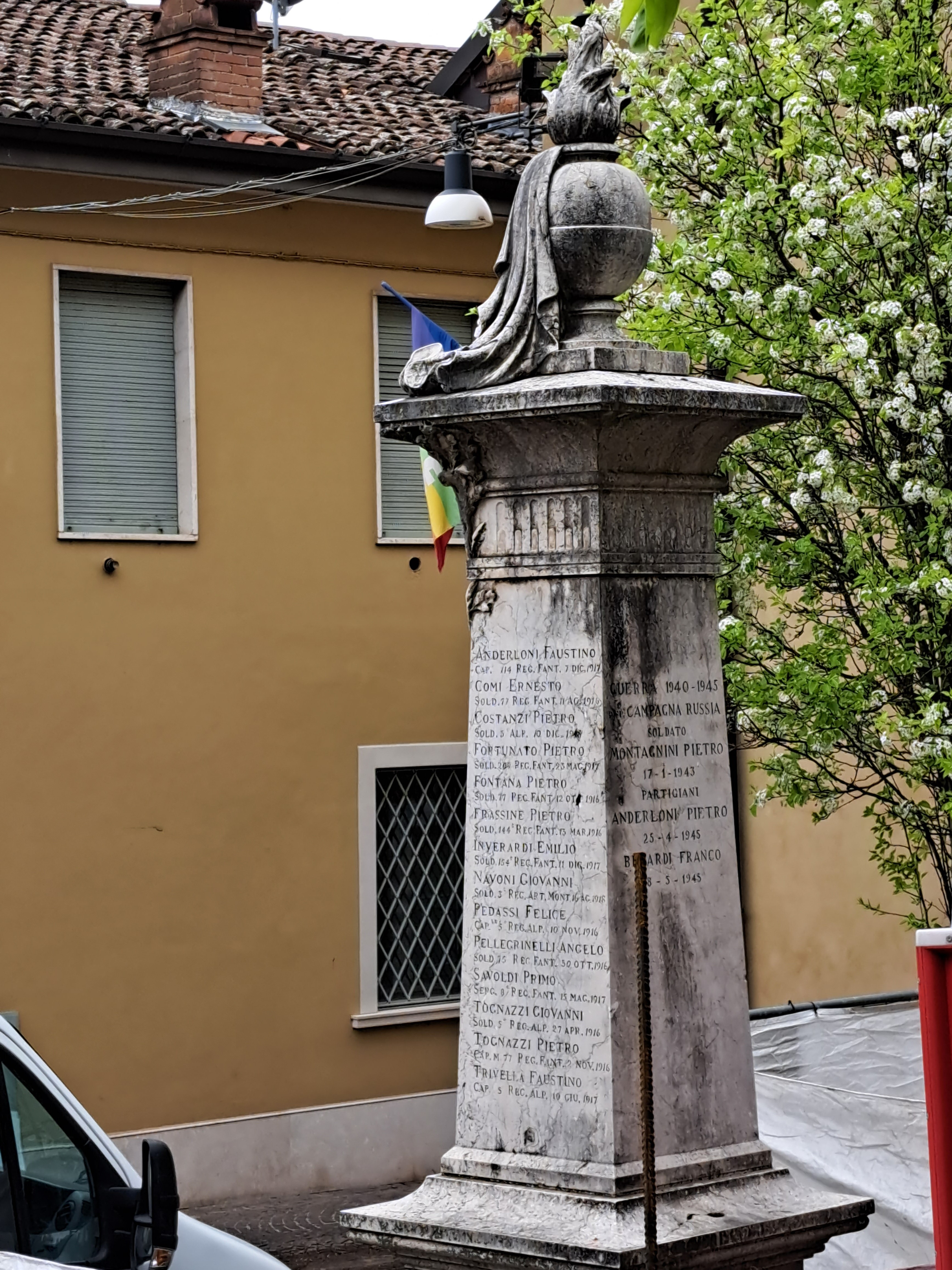 Il monumento si trova al principio della via che porta al cimitero. L'area di rispetto è delimitata da una elaborata cancellata in ferro, che pare coeva e i cui 4 angoli raffigurano altrettante torce sprigionanti una fiamma (è pitturata di rosso). L'obelisco è strutturato in due sezioni. La parte inferiore, nella formella frontale, reca un tropaion con una riproduzione piuttosto fedele, ma non proporzionata, di un elmo Adrian, una sciabola, ed un fucile modello 1891; completa il trofeo una stella d'Italia raggiata e due fronde, di alloro e quercia. La 4 facciate della parte superiore accolgono le epigrafi incise: sul frontale, la dedicatoria, sulle altre 3 i nomi dei caduti. L'obelisco termina in un capitello quadrato, fregiato sul fronte da due fronde di quercia scolpite ad altorilievo. Esso sorregge un'olla, velata da un sudario, dalla quale si sprigiona la fiamma del sacrificio o del ricordo. Per i morti nella guerra di Libia (1) e quelli nella Grande guerra (16), si specifica: cognome, nome, grado, reparto (a livello di reggimento) e data di morte. Per i morti nella guerra d'Etiopia (1) e nella guerra 1940-1945 (4), si precisa: cognome, nome, data di morte, talvolta la località; la qualifica di partigiano è specificata. Nell'area di rispetto, sul lato frontale, è stata collocata una bombarda da 240 mm, interrata dalla parte del codolo, in dotazione all'artiglieria italiana nella Grande guerra