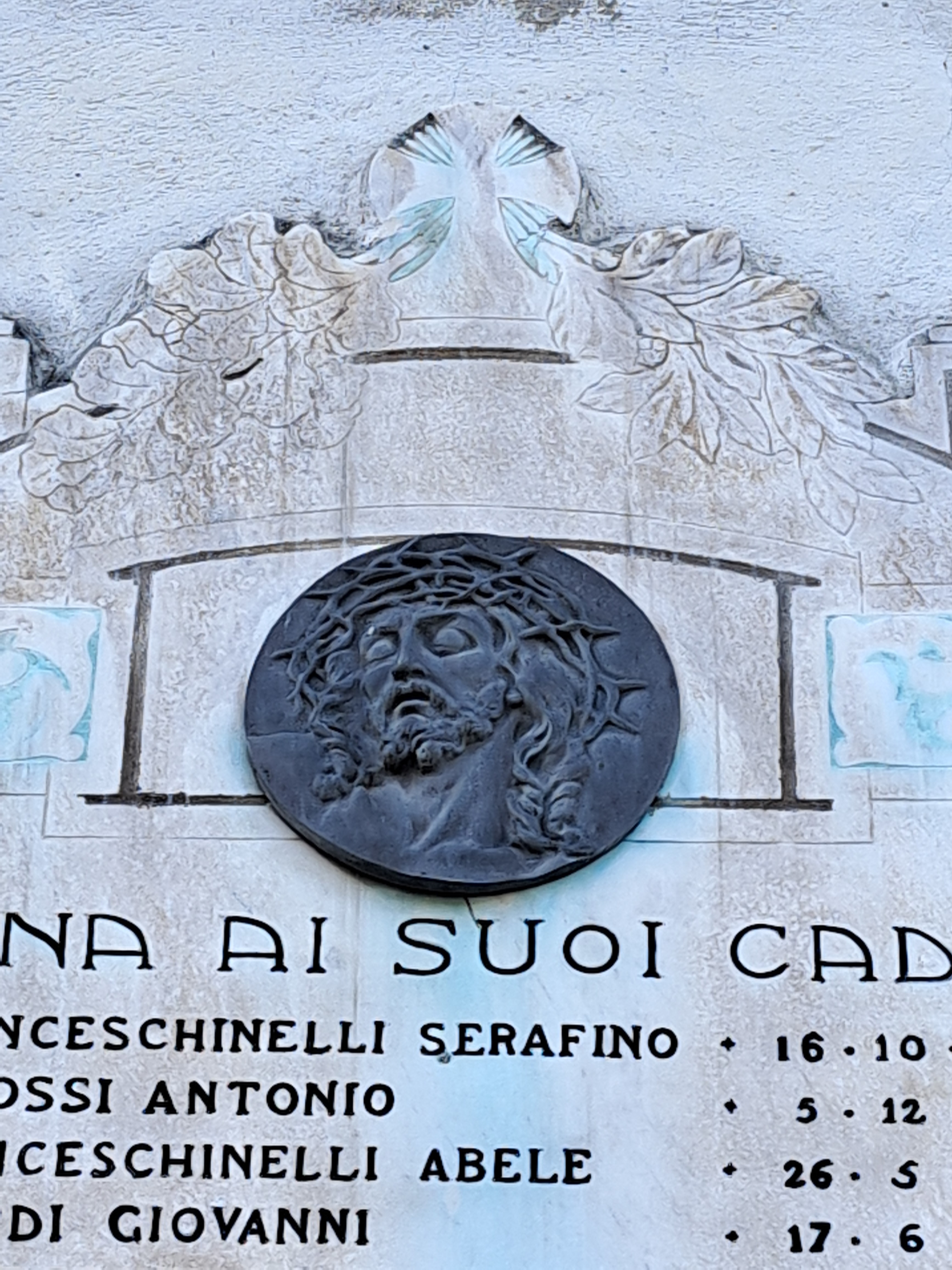 - NOTIZIE STORICO CRITICHE La lapide fu inaugurata nella seconda decade dell'aprile 1921, forse domenica 16. La festa "ebbe carattere esclusivamente religioso e ciò per volontà concorde di tutti gli ex militari del paese che, stretti da un vincolo di cameratismo ideale, vollero così, al di sopra di ogni idea partigiana, commemorare i fratelli, i compagni, sacrificatisi sull'altare della Patria"; l'oratore ufficiale fu il reverendo prof. Giovanni Giudici da Sale Marasino, collaboratore del movimento cattolico. Questo approccio preferenzialmente religioso-cattolico si nota anche nell'epigrafe, di fatto, a-patriottica, e nella significativa presenza di riferimenti simbolici a Cristo, come la croce e soprattutto il suo volto (unico altro caso riscontrato in questa campagna di catalogazione è ad Acqualunga, cfr. scheda specifica). La lapide sembra ancora quella originaria disegnata da Timo Bortolotti, ma fu modificata con l'aggiunta dei caduti nella guerra 1940-1945, più numerosi che nella Grande guerra. Fonti e bibliografia: Da Corna Camuna. Pei morti in guerra, "Il Cittadino di Brescia", 20-4-1921