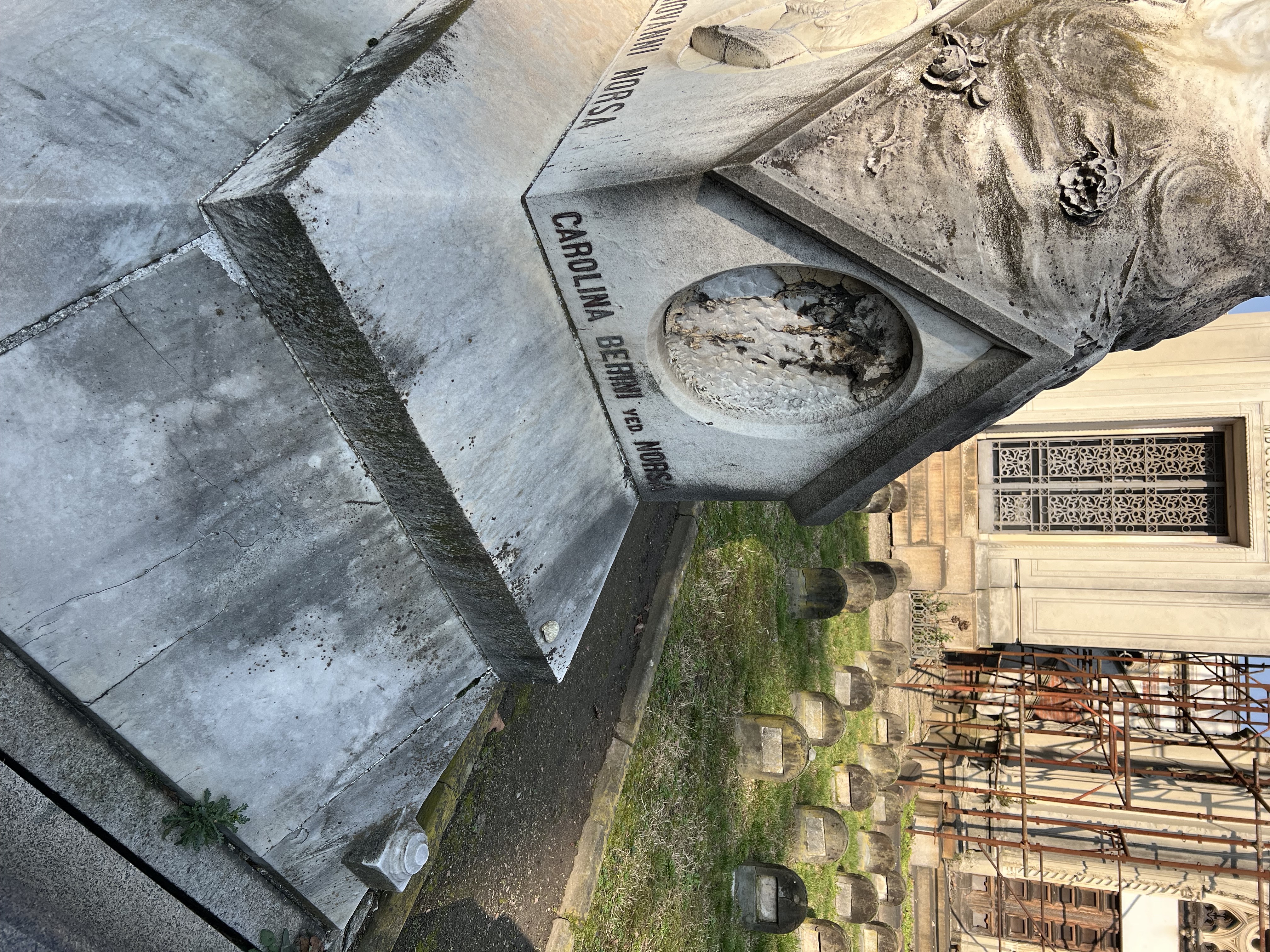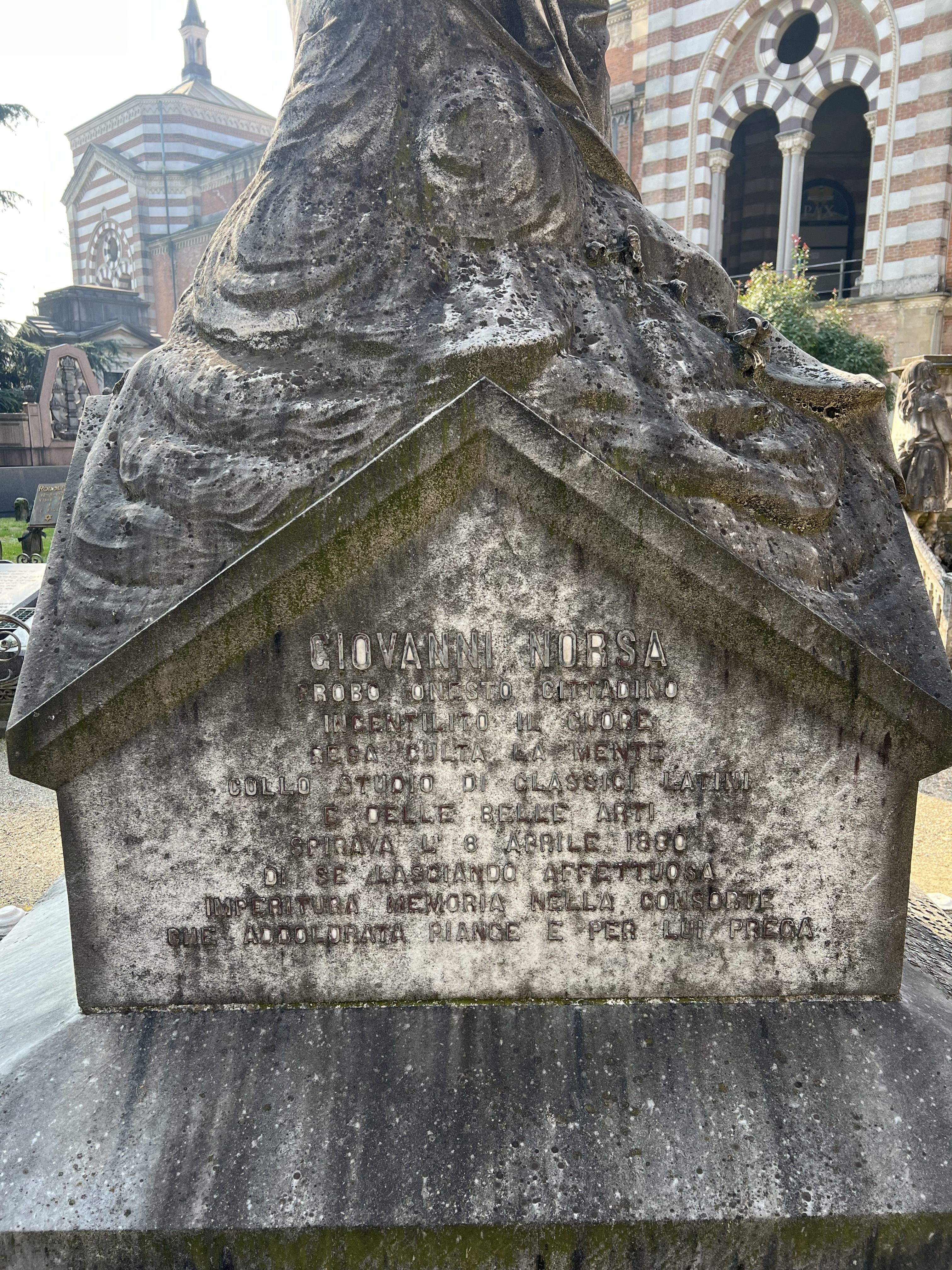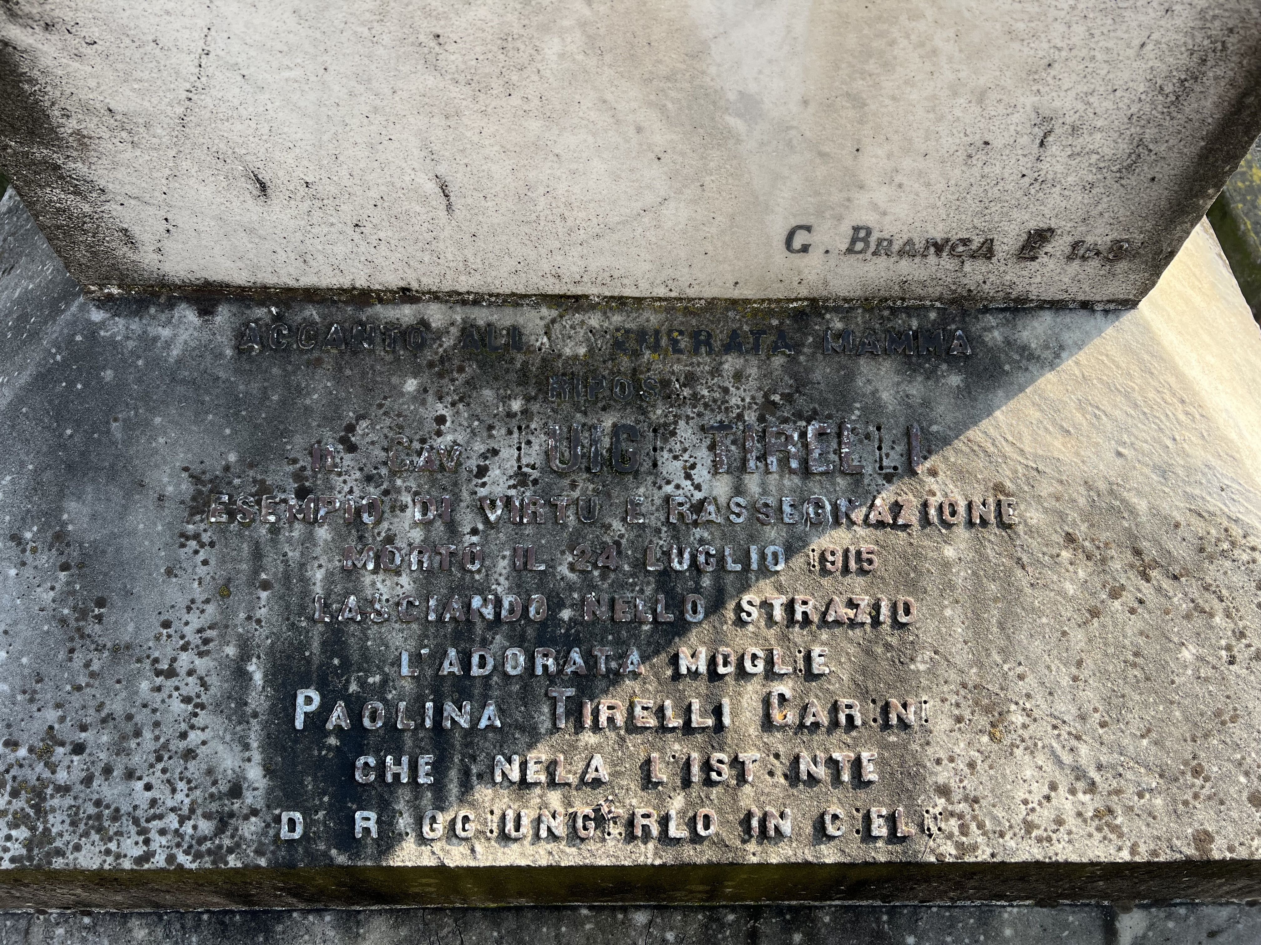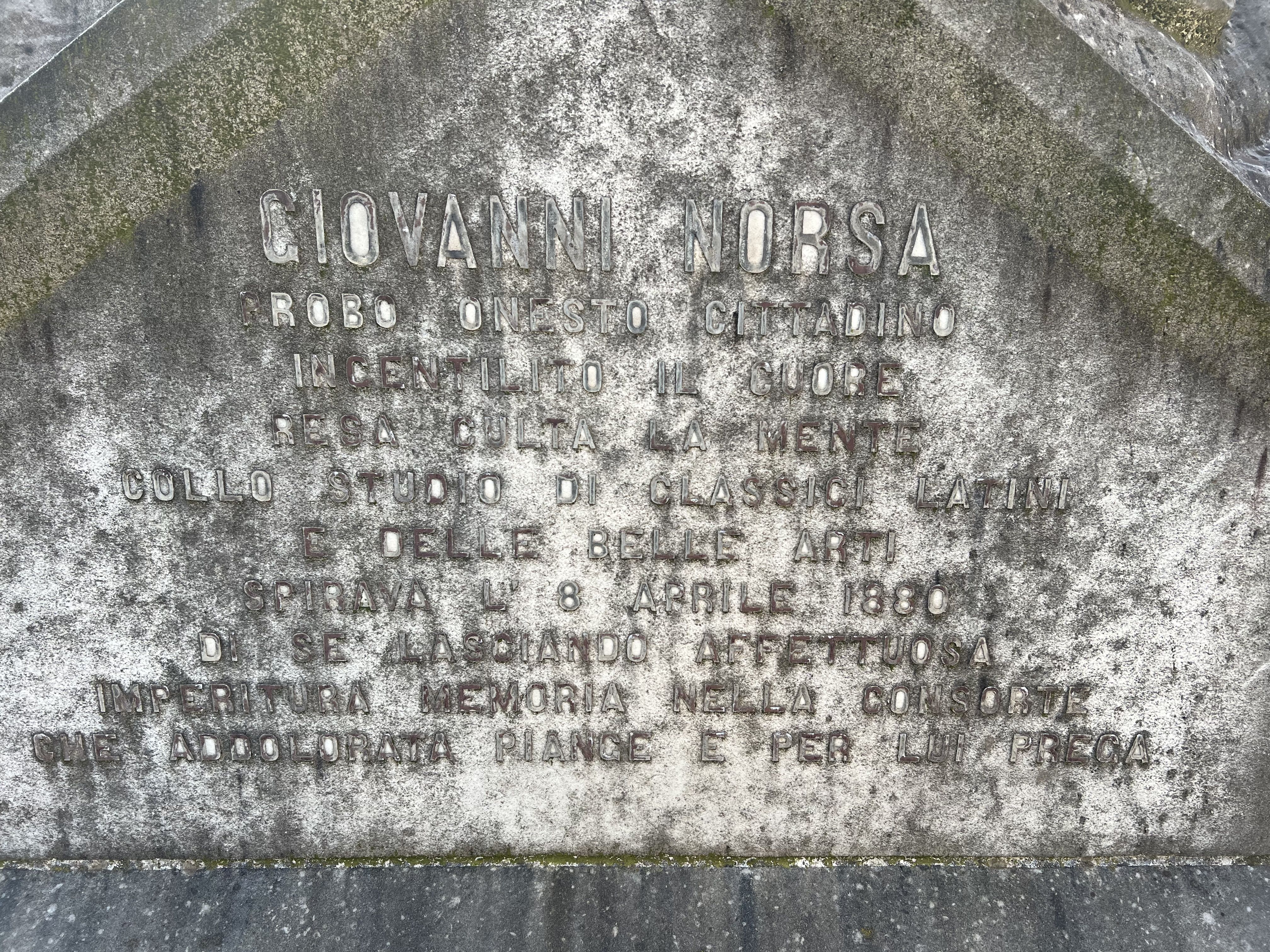 • ISCRIZIONI al centro - Lato frontale: Giovanni Norsa; lato destro: Carolina Bersini ved. Norsa; lato sinistro: Accanto alla venerata mamma riposa il cav. Luigi Tirelli, esempio di virtù e rassegnazione morto il 24 luglio 1915 lasciando nello strazio l’adorata moglie paolina Tirelli Carini che anela l’istante di raggiungerlo in cielo -