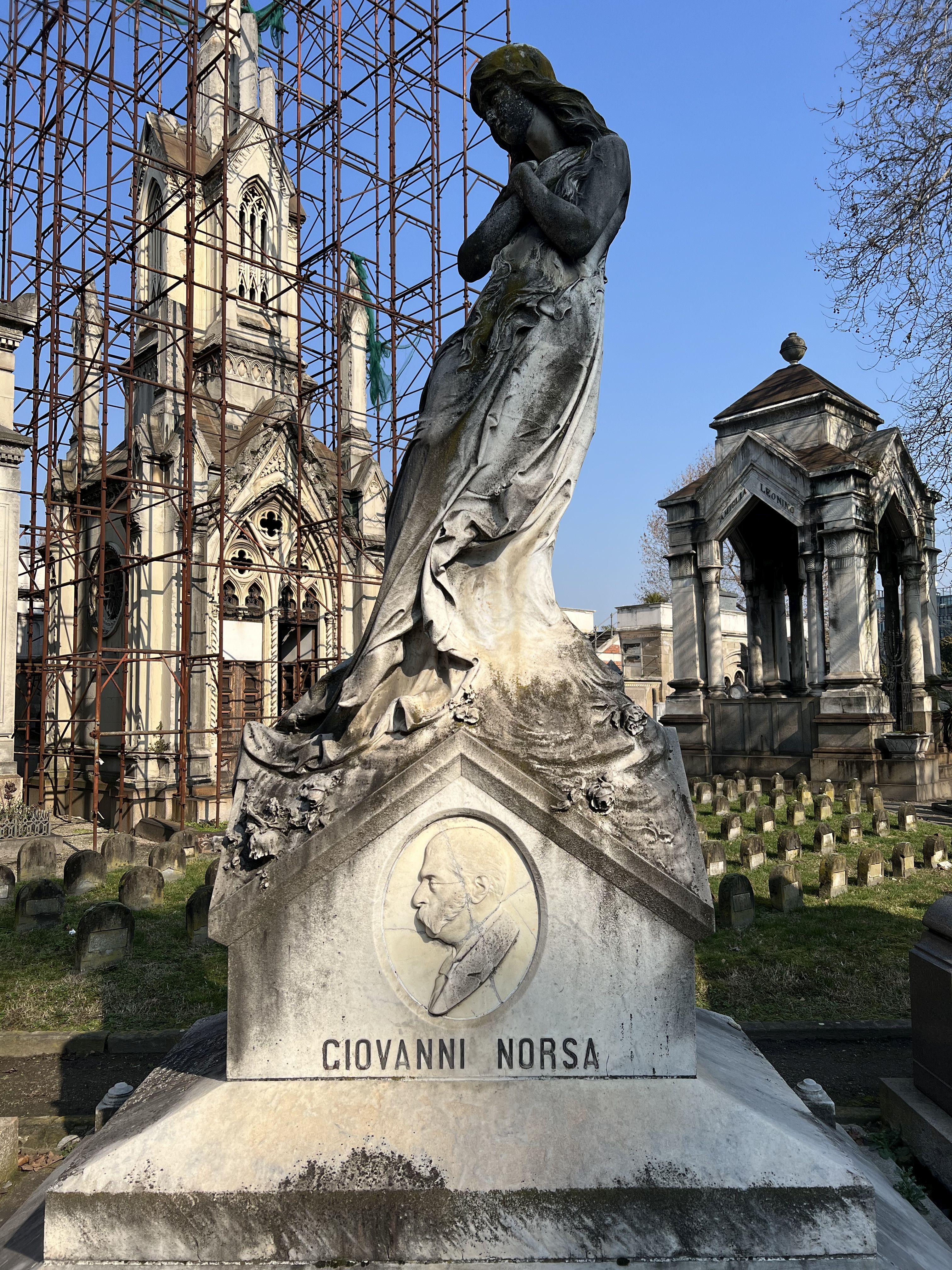 • NOTIZIE STORICO CRITICHE Giovanni Norsa (1813-1881) fu un grossista nato a Milano figlio del mantovano Aron Cervo Norsa. Possedeva un palazzo in via Montenapoleone e 250 ettari di terre affittate fuori Porta Ticinese. Sposò una donna cattolica, Carolina Berini vedova Tirelli, che aveva già un figlio, Luigi, sepolto nello stesso monumento. Studiò i classici latini e le belle arti secondo l’epigrafe sul monumento. Carolina commissionò nel 1881 allo scultore Giulio Branca (1850-1926), nato a Cannobbio ma trasferitosi a Milano per seguire l’accademia di Brera, l’opera chiamata “Apoteosi dell’anima” in marmo di Carrara per la tomba del marito. Il monumento funerario è decorato con due medaglioni dei coniugi, di cui uno è scomparso. Branca ha realizzato circa quattrocento monumenti commemorativi, monumenti funerari e busti ritratto