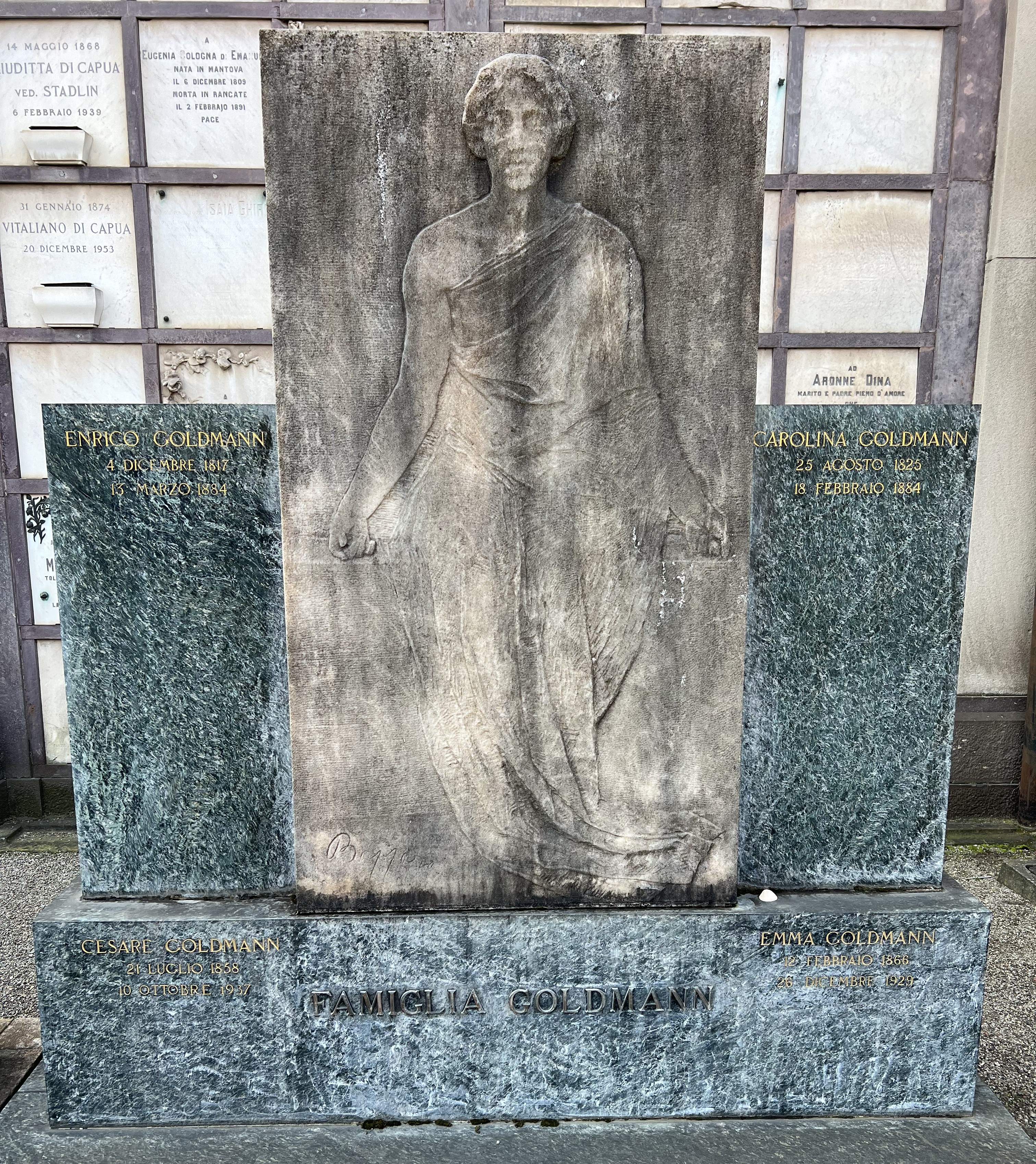 - ISCRIZIONI al centro - Lato sinistro, in alto: Enrico Goldmann, 4 dicembre 1817 – 13 marzo 1884; in basso: Cesare Goldmann, 21 luglio 1858 – 10 Ottobre 1937; al centro, in basso: Famiglia Goldmann; lato destro, in alto: Carolina Goldmann, 25 Agosto 1825 – 18 febbraio 1884, in basso: Emma Goldmann. 12 Febbraio 1856 – 26 Dicembre 1929 -