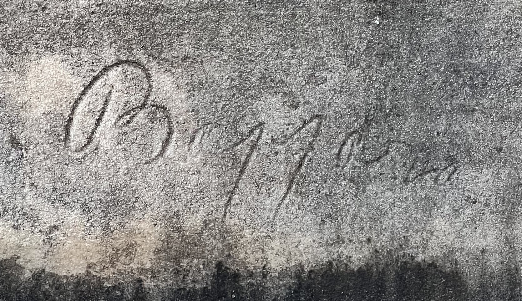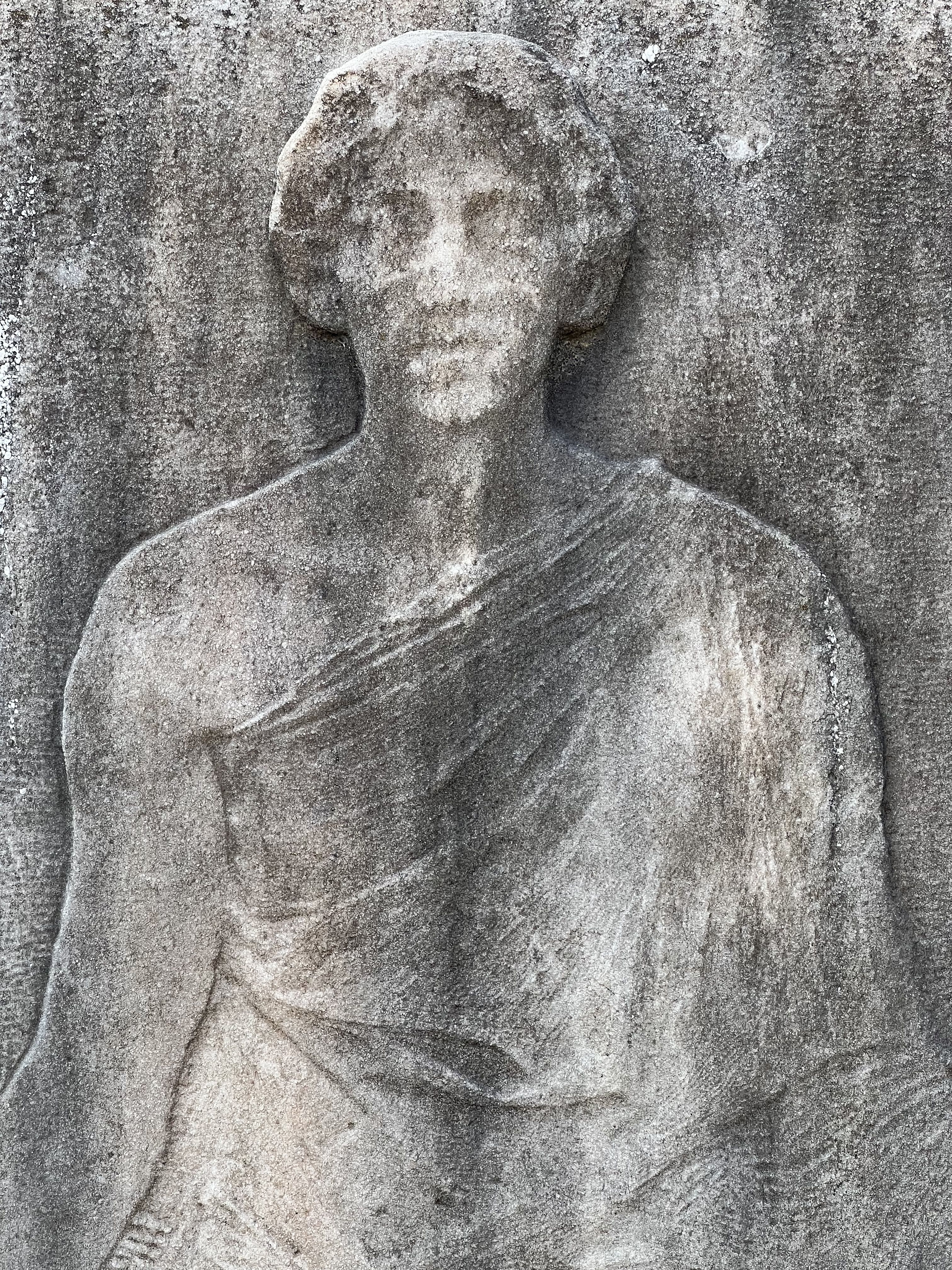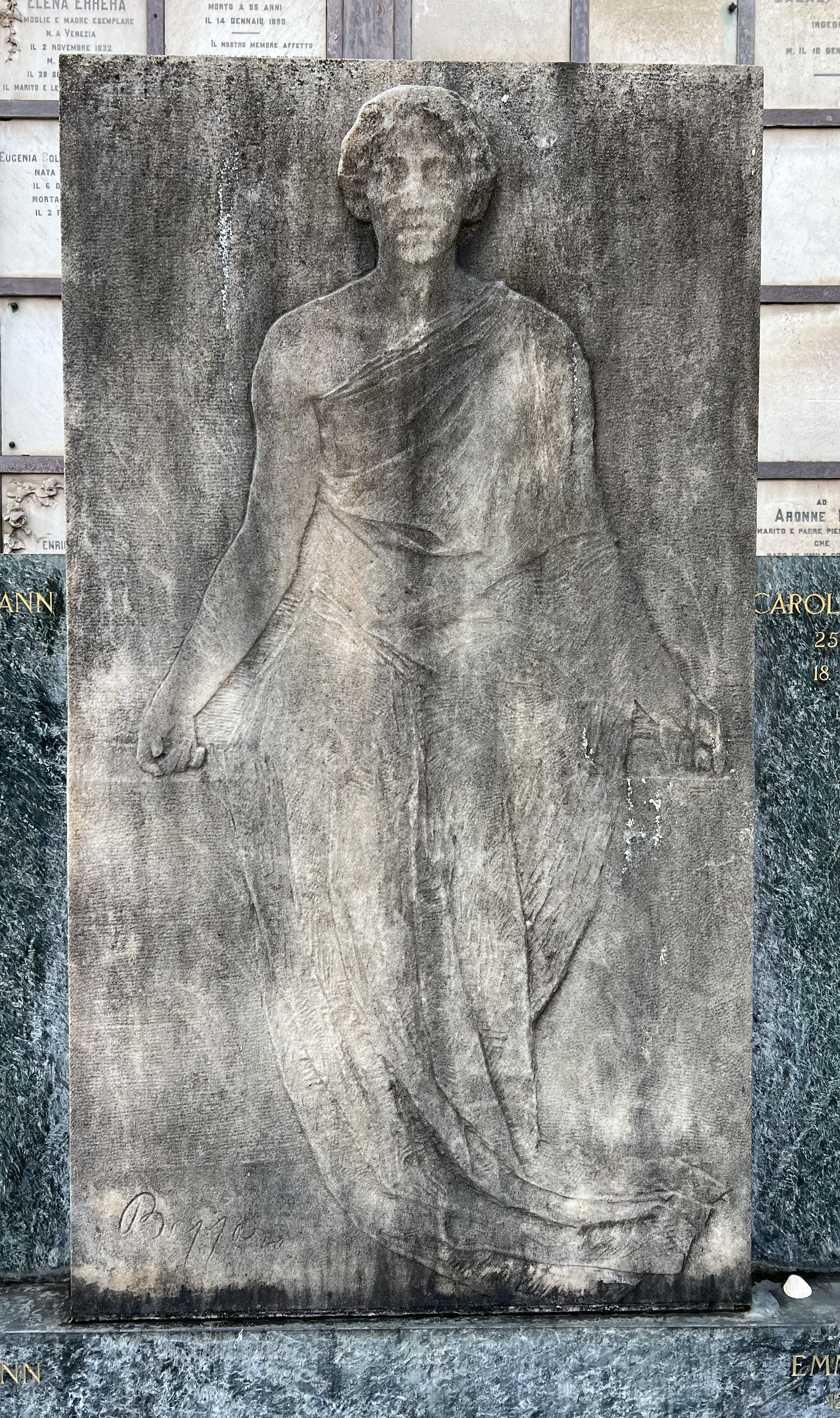 Monumento funebre familiare composto da una lastra di serpentino posata a terra e un’alzata in serpentino con lastra centrale in marmo bianco decorata a bassorilievo con una figura femminile seduta, avvolta in un peplo allacciato su una sola spalla, con le braccia allargate a fianco del busto