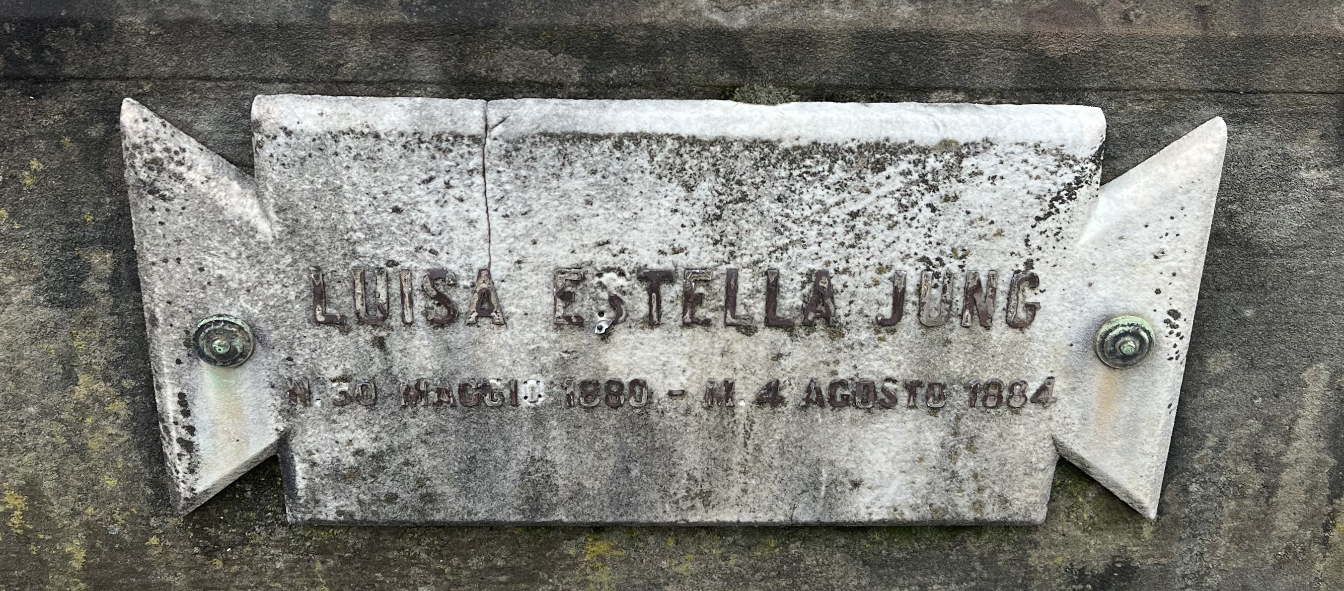 - ISCRIZIONI al centro - Lato frontale: Luisa Estella Jung. N. 30 Maggio 1880 – M. 4 Agosto 1884; lato sinistro: Dormi tesoro, dormi angioletto adorato, ti sta vicino il tuo nonno -