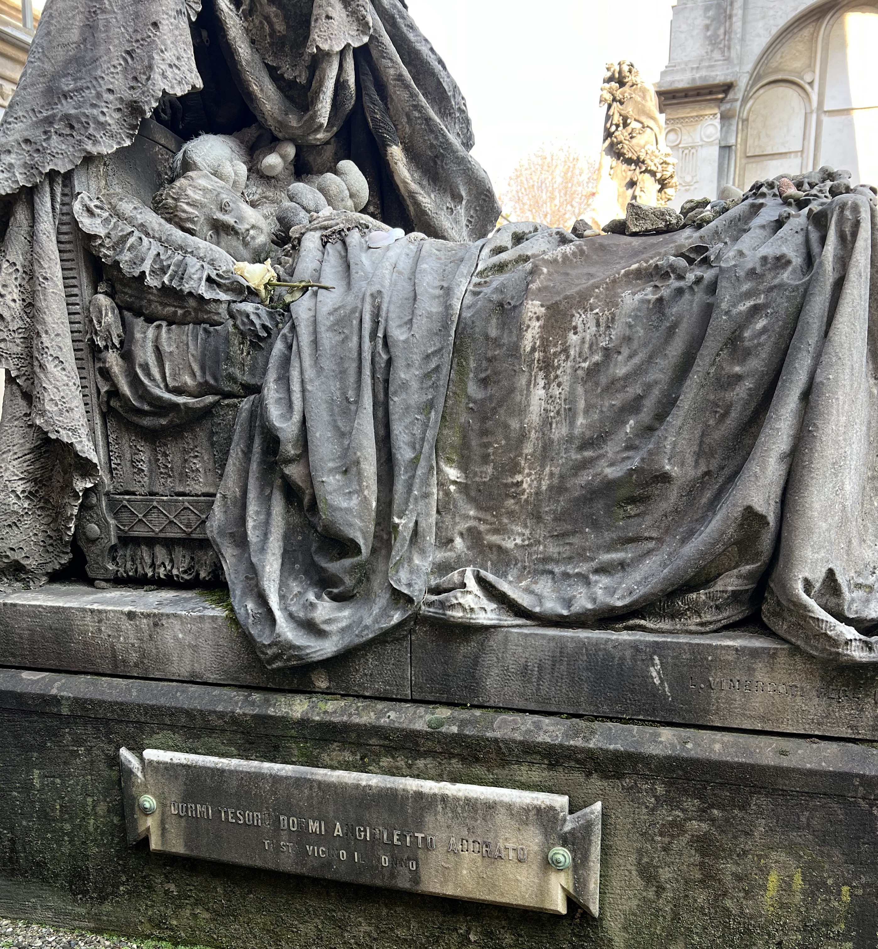- NOTIZIE STORICO CRITICHE Luisa Estella Jung morì nel 1884 all’età di 4 anni. Lo scultore milanese Luigi Vimercati (1828-1893) realizzò un monumento in marmo di Carrara in cui la bambina dorme in un lettino con un angelo che veglia su di lei proteggendola con una stoffa ricamata