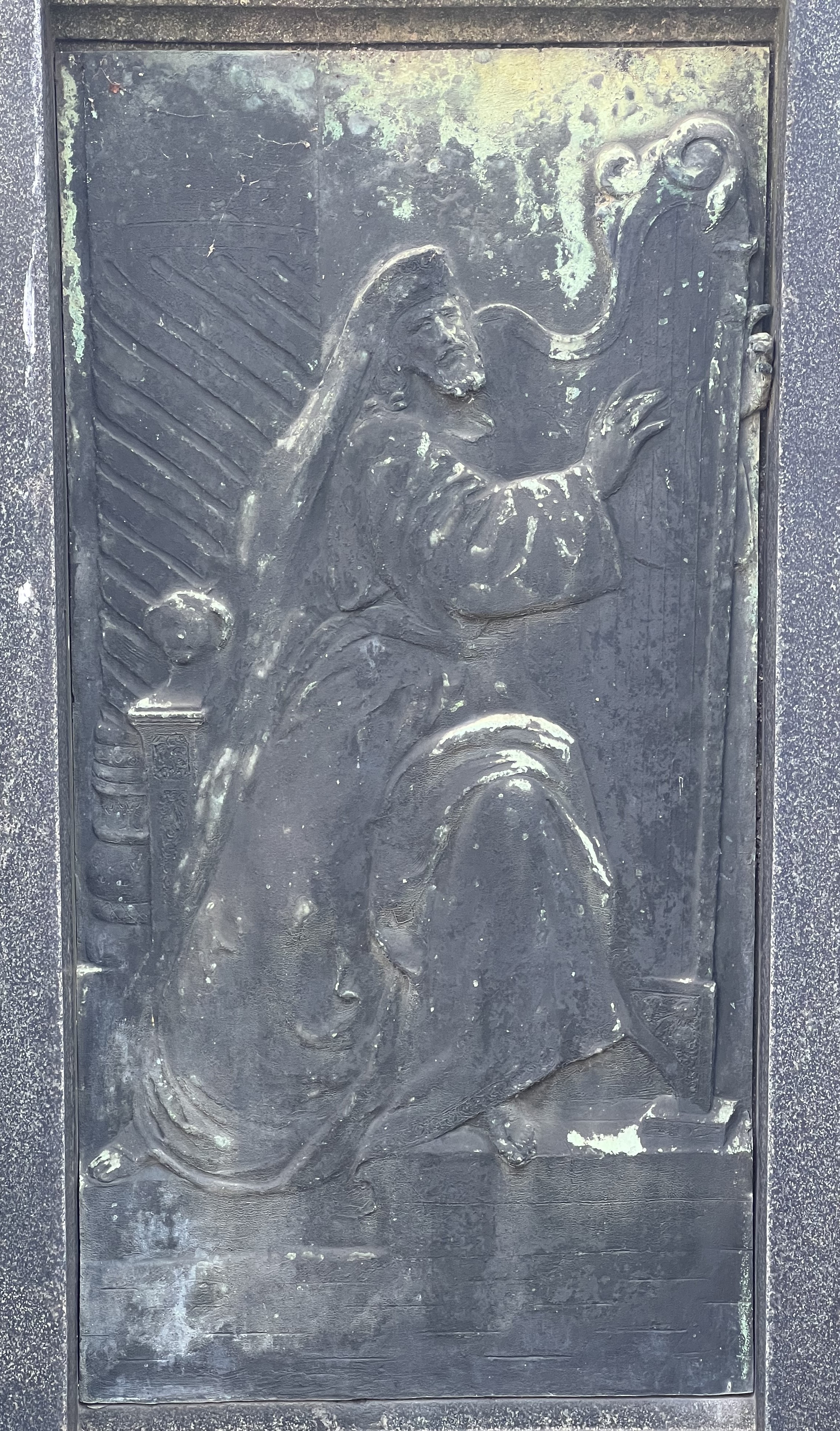 Stele con due colonnine che inquadrano un rilievo rettangolare in bronzo, con base e architrave modanato. Il pannello bronzeo è decorato a basso rilievo da una figura umana seduta su un trono, con copricapo e lunga veste, che suona l'arpa: il re David. Cassa liscia, decorata sulla superficie superiore da iscrizione su 9 righe in lettere bronzee, parzialmente conservata