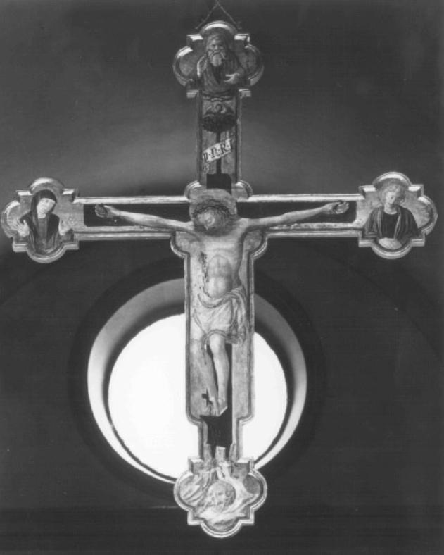 - NOTIZIE STORICO CRITICHE Proviene dalla chiesetta di San Biagio (Tencarola), che era stata sotto la tutela dell'abbazia di Praglia, nel primo '900. Viene ritenuta opera di un artista padovano, attivo alla fine del 4° decennio del '400, precedente alla venuta dei grandi maestri toscani (Grossato, 1974, n. 63). L'esecuzione del Cristo sembra rimanere ad un livello artigianale, rispetto alle figure della Madonna e di San Giovanni, dall'impasto morbido e dai colori chiari. Si noti pure una certa forzatura espressiva in questa faccia della croce
