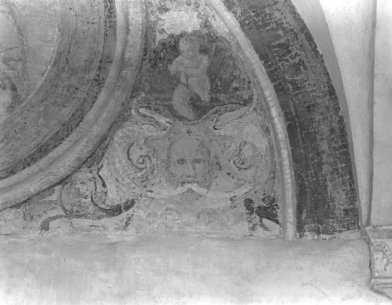 Decorazione nell'angolo destro di un lunettone che comprende motivi vegetali, un putto in una conchiglia e un mascherone entro una cornice a riccio