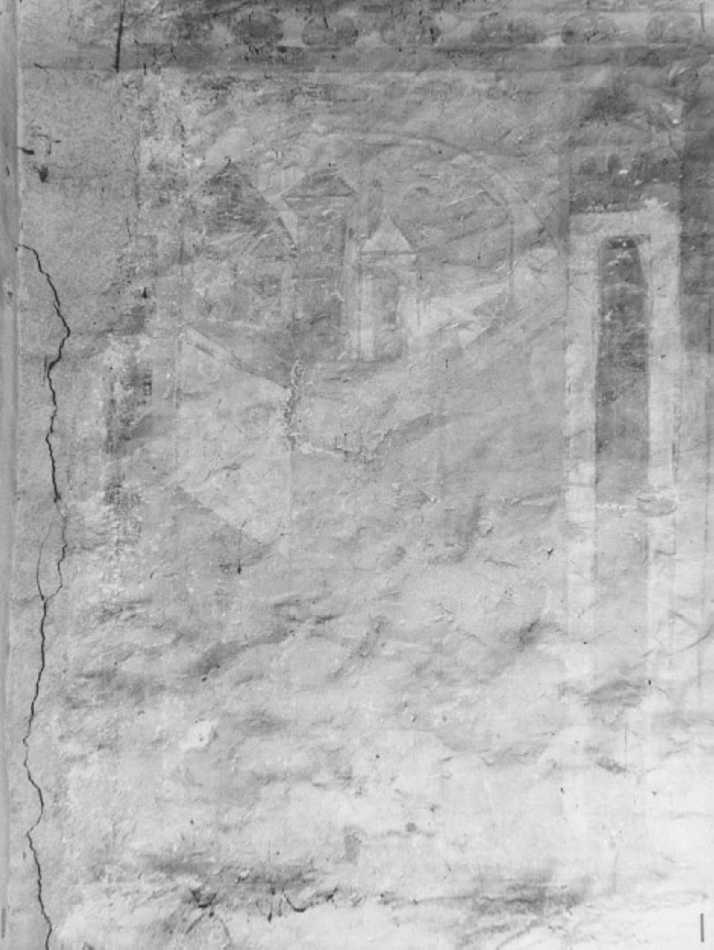 - NOTIZIE STORICO CRITICHE La fascia di cui fa parte questo frammento fu affrescata sempre nel corso del secolo XII, come la prospicente parete illustrante il ciclo dell' Apocalisse. Tuttavia questa parete settentrionale rivela caratteristiche un pò più tarde nella tipologia della figure e nel linearismo più mosso e largo che non blocca, ma costruisce con ampiezza la massa del corpo