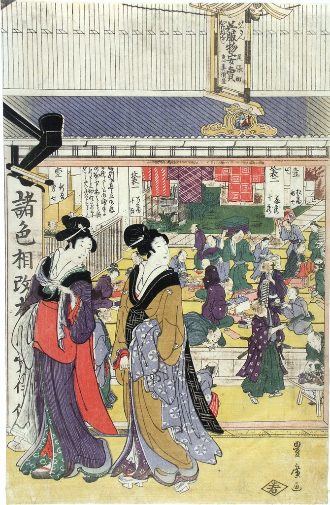 Figure femminili: due giovani donne; folla di persone. Paesaggi: negozio di stoffe