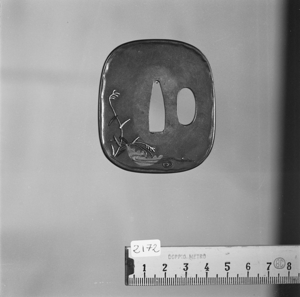 Tsuba in shibuichi di forma nade-kaku. Katahitsu. Lavorazione in ishime-ji, iroe taka-zogan in argento. Rappresenta sul recto un airone presso un corso d'acqua, sul verso la luna riflessa nello specchio d'acqua e canne