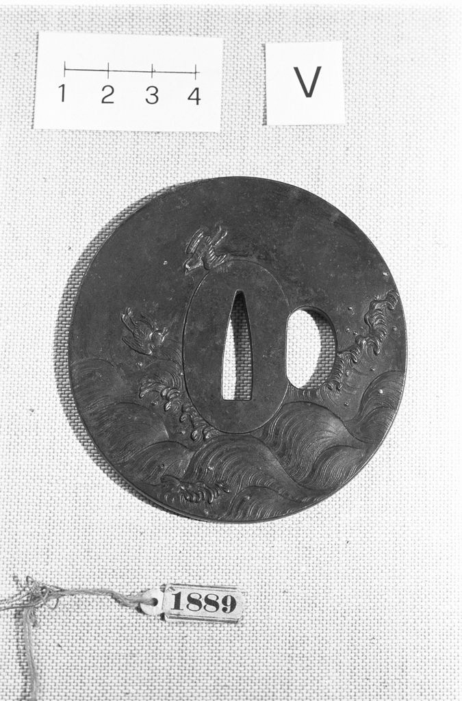 Tsuba di forma ovale. Katahitsu. Lavorazione in usuniku-bori e iroe-taka-zogan. Rappresenta dei pivieri tra le onde