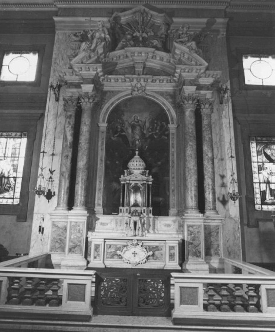 - NOTIZIE STORICO CRITICHE L'altare, un tempo posto nell'abside come altar maggiore, fu sostituito dall'attuale, consacrato nel 1932; a sua volta sostituiva l'altare li- gneo costruito nel 1598 (la pala vi fu posta nel 1603 v. scheda dell'As- sunta). Le fonti lo danno eseguito nel 1729 (v. A. Benetti, op. cit, p. 278) ma essendo morto il Marinali nel 1720, l'opera S senz'altro an- teriore