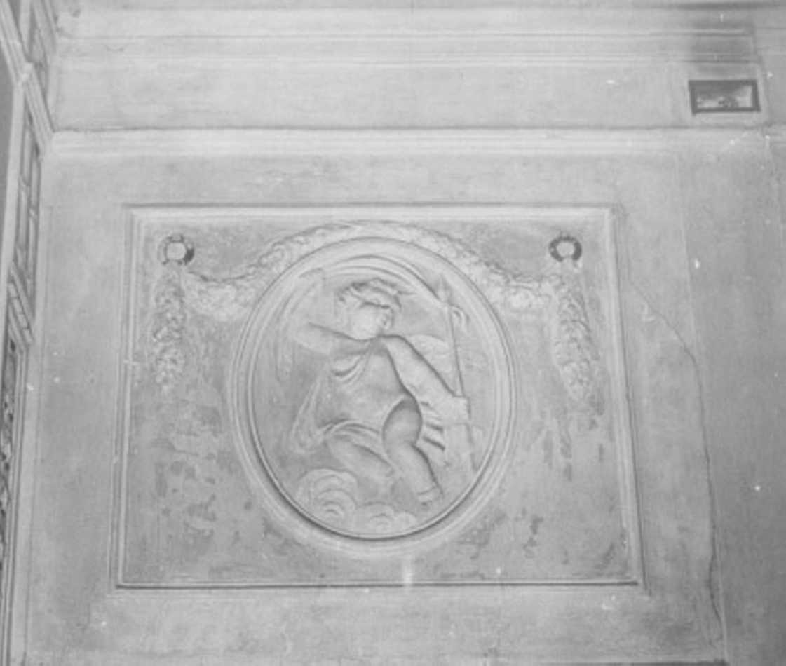 - NOTIZIE STORICO CRITICHE Gli stucchi di questa sala paiono spettare a maestranze diverse da quelle, gia' orientate verso un gusto neoclassico, attive nelle sale successive. Il putto e' ancora memore di rotondita' e morbidezze secentesche, sebbene le campiture spaziali, l'appiattimento della figura e le stilizzazioni siano di gusto settecentesco
