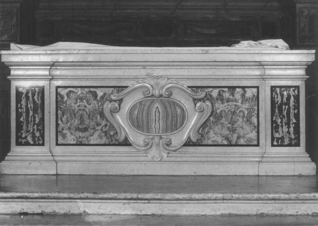 Fronte formata da specchiature in marmi variegati tra due fasce modanate in marmo bianco. Al centro cornice aggettante, mistilinea, con volute
