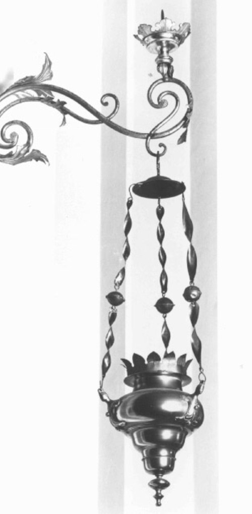 Lampada pensile a triplice sopspensione formata da vari nodi(di cui quello centrale più grande costituisce il corpo vero e proprio della lampada) intervallate da gole lisce con coronamento a foglie lanceolate. I tre attacchi per le catene a torciglione con nodo al centro, sono costituiti da figure stilizzate