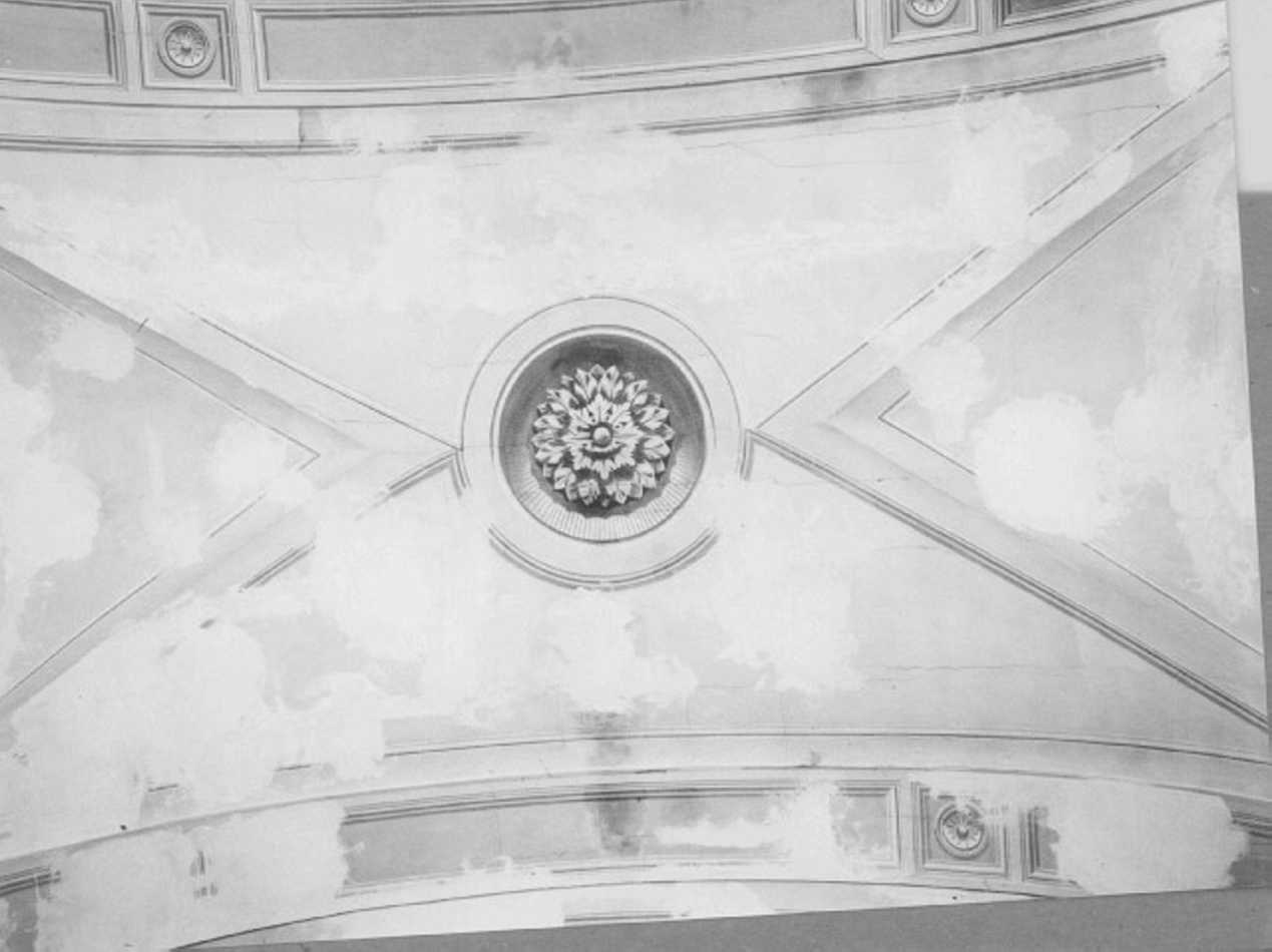 Le tre campate del soffitto della navata della chiesa sono ornate da affreschi monocromi raffiguranti una finta volta a costoloni; al centro e' un clipeo contenente un motivo vegetale a foglie lanceolate e d'acanto