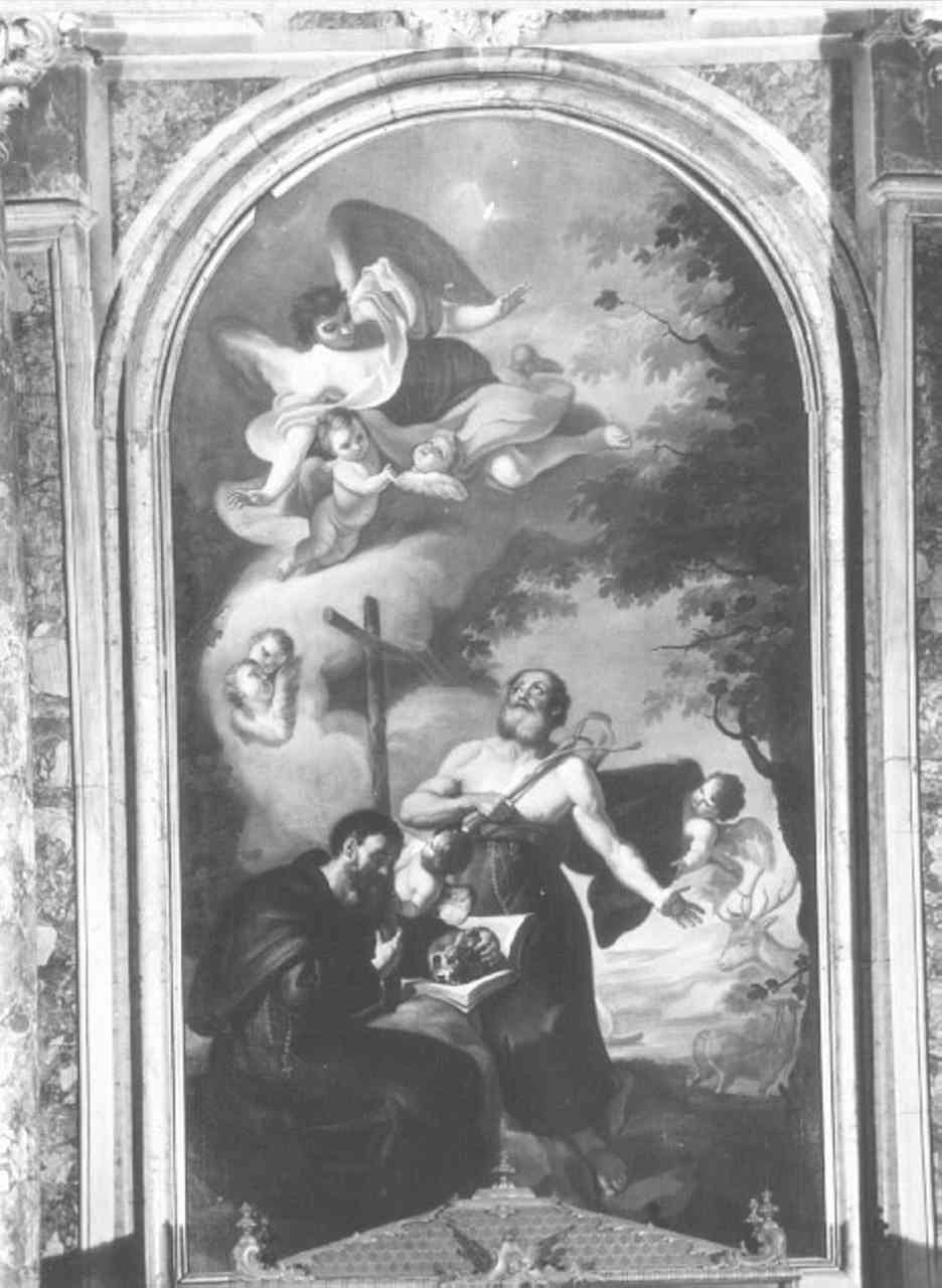 Personaggi: San Benigno; San Caro. Figure: angeli. Oggetti: croce; libro; teschio; scudiscio. Figure: angeli. Paesaggi: paesaggio lacustre. Animali: pecora; cervo