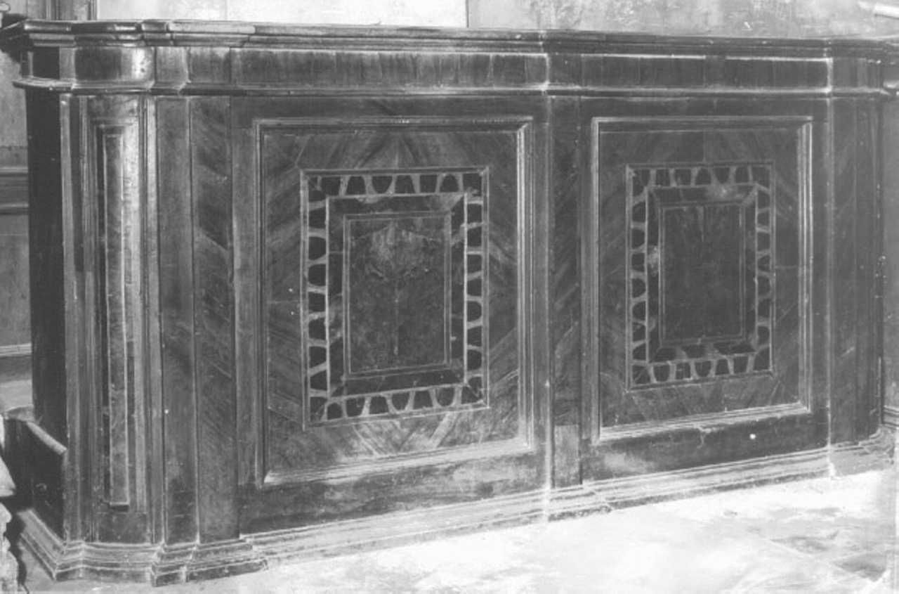 Bancone da sagrestia con fronte a due specchiature divise da lesene, angoli smussati. Sul retro: inginocchiatoio, quattro sportelli