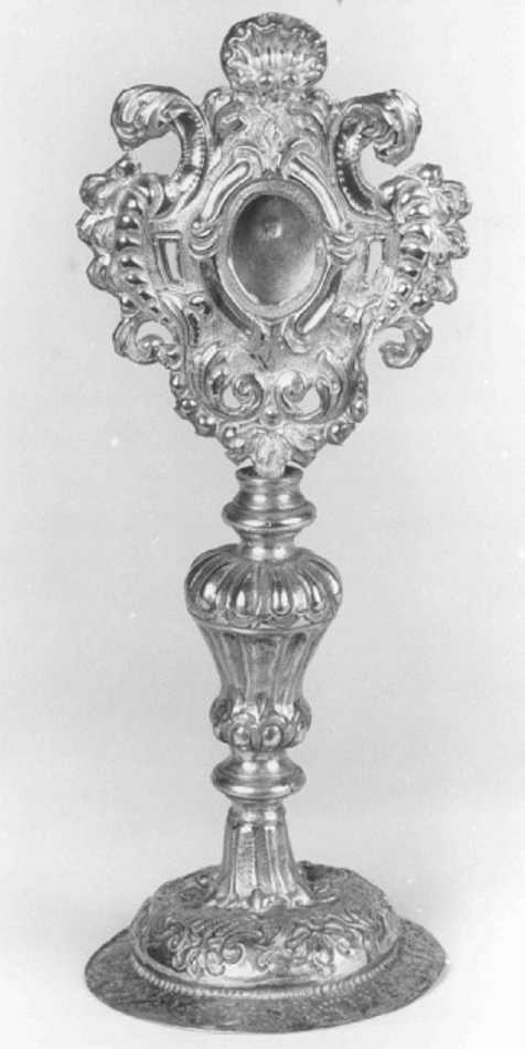 Reliquiario-ostensorio con nodo a vaso baccellato. Piede a cupolino. Decorazione a volute e motivi fitomorfi