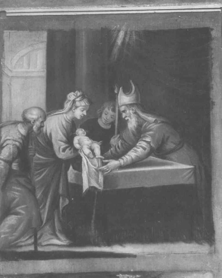 Personaggi: Madonna; Gesu' Bambino; sacerdote Simeone; San Giuseppe. Figure: giovanetto. Attributi: (San Giuseppe) bastone. Abbigliamento: veste lilla ; manto verde; copricapo; veste bianca e gialla; manto giallo Fenomeni naturali: luce