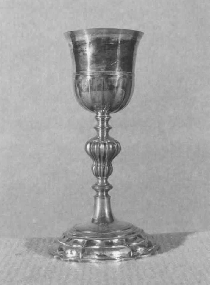 Piede : a sezione circolare mistilinea. Nodo : piriforme. Coppa: a cam- pana
