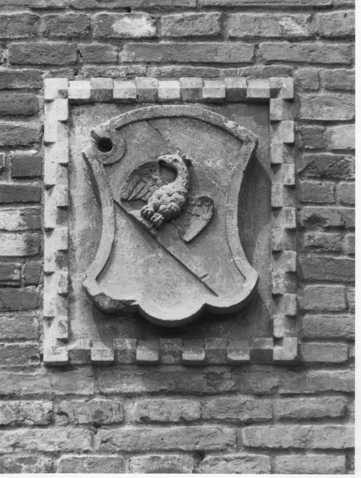 Stemma in rilievo dentro una cornice rettangolare merlata