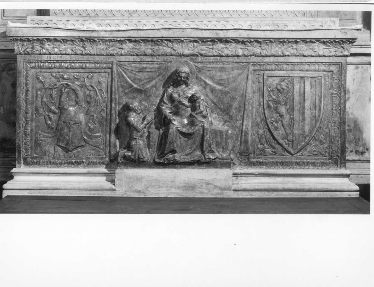 - NOTIZIE STORICO CRITICHE Il riconoscimento di questa lastra si deve al Magrini (1848) che ide ntificò l'iscrizione della fascia superiore con la parte finale di q uella incisa sulla tomba del capitano fiorentino Gangalando dei Gang alandi, già nella chiesa di S. Lorenzo. Acquistata dalla famiglia Co nti e qui collocata dal 1797, la lastra era dunque parte frontale di una tomba assai più grande e completa che al tempo del Barbarano ap pariva sollevata. Si tratta di opera di buona qualità, che si data solitamente intorno al 1359, anno di morte di Gangalando. Recentemen te il rilievo è stato attribuito dal Mellini (1971) a Giovanni di Ri gino, scultore veronese del Trecento (Gangalando ere stato podestà d i Verona)