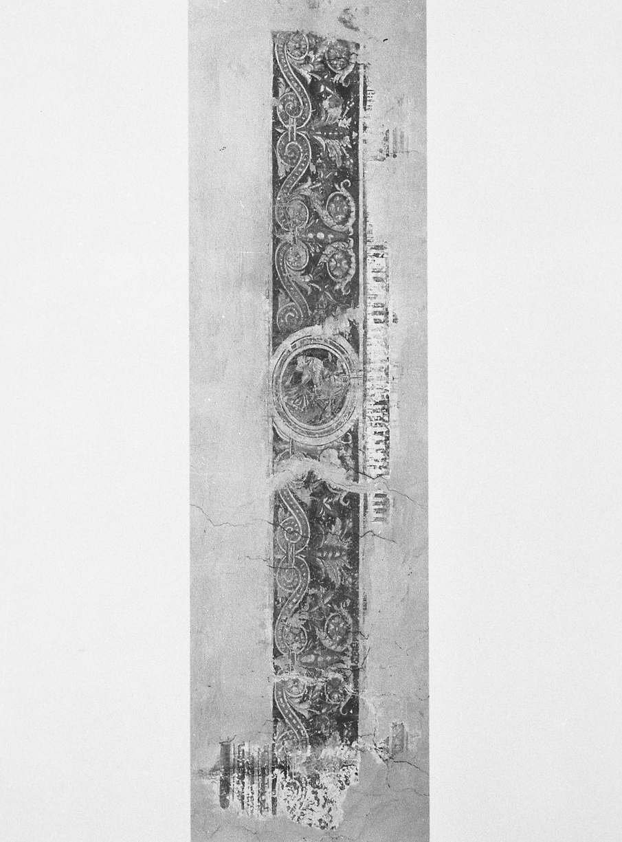 Dipinto murale. Fregio a motivi vegetali disposti simmetricamente, interrotto da finti oculi con figure. Decorazione: doppie volute accoppiate ; foglie d'acanto; panoplie; rose