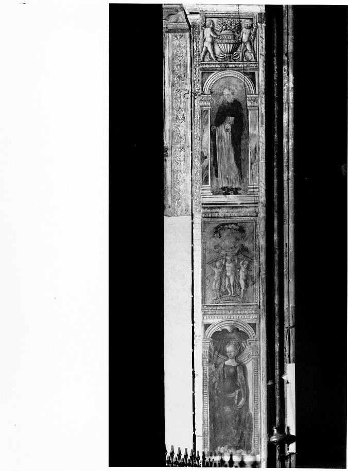 - NOTIZIE STORICO CRITICHE Per questi affreschi, ignorati dalle consuete fonti e dalle guide ottocentesche fattoforse dovutoall'essere stati i riquadri coperti permoltotempoda uno strato di scialbo mancanoindagini storico-critiche e attribuzioni.Non pare tuttavia difficile, sulla base di un'analisi stilistica, datarli alla seconda metà del XV secolo, attribuendoli ad un artista di ambito mantegnesco vicino a pittori veronesi