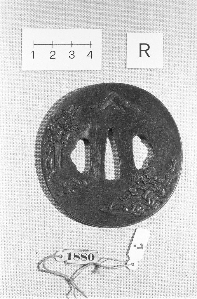 TSUBA CON RYOHITSU. LAVORAZIONE IN USUNIKU-BORI. RAPPRESENTA SUL RECTO UN' IMBARCAZIONE CON DUE PASSEGGERI, UNA CASCATA E MONTI NELLO SFONDO; SUL VERSO UN PAESAGGIO MONTANO CON UN'ALTO EDIFICIO, UN PONTE E TRE FIGURE