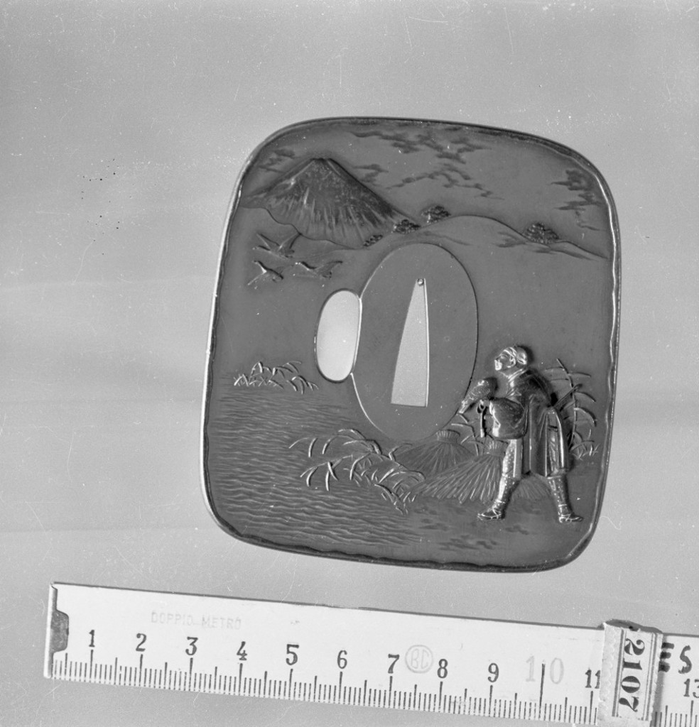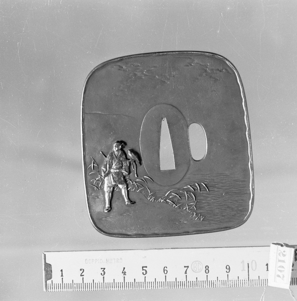 TSUBA DI FORMA AORI SQUADRATA. KATA-HITSU E FUKURIN IN ARGENTO. LAVORAZIONE IN TAKA-NIKU-BORI IROE-TAKA-ZOGAN, SUEMON-ZOGAN (FIGURE), TETSU-NURI (CAPIGLIATURA), SUKI-DASHI-BORI (NUVOLE). RAPPRESENTA UNA SCENA DI CACCIA COL FALCO, SUL RECTO IL FALCONIERE, SUL VERSO L'AIUTANTE
