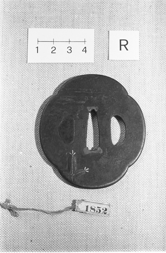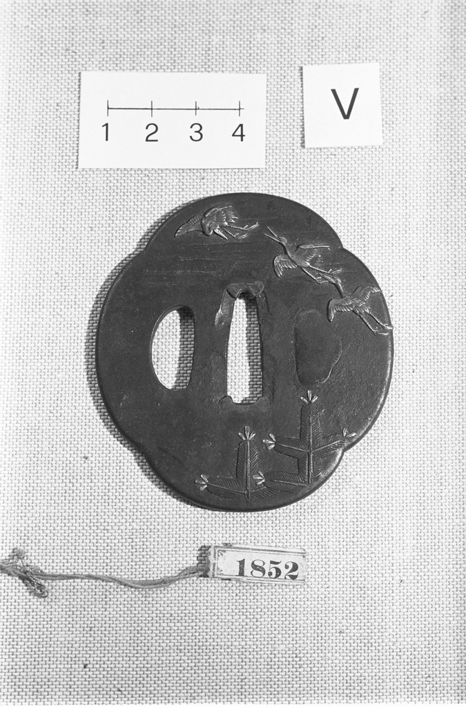 TSUBA DI FORMA NADE-MOKKO. RYO-HITSU DI CUI KOGAI-HITSU TAMPONATO IN SHAKUDO. LAVORAZIONE IN TAKA-BORI IROE-TAKA-ZOGAN. RAPPRESENTA SUL RECTO LA CIMA DI UN PINO TRA LE NUVOLE, SUL VERSO TRE GRU IN VOLO TRA CIME DI GIOVANI PINI