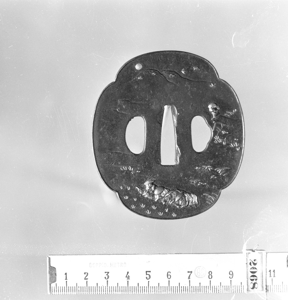 TSUBA DI FORMA NADE-MOKKO. RYO-HITSU. LAVORAZIONE IN TAKA-BORI IROE-TAKA-ZOGAN, USU-NIKU-BORI. RAPPRESENTA SUL RECTO UN CONTADINO CHE TRACCIA IL SOLCO CON UN ARATRO TIRATO DAL BUE, SUL VERSO QUATTRO DONNE PIANTANO LE PIANTINE DI RISO, UN CONTADINO ATTINGE L'ACQUA SULLO SFONDO