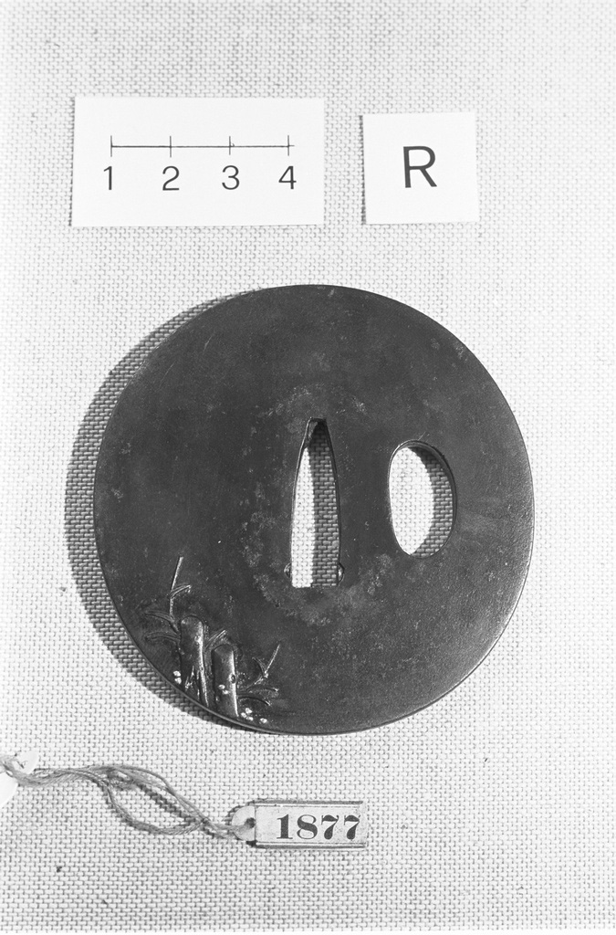 TSUBA CON KATA-HITSU. LAVORAZIONE IN TAKA-BORI IROE-TAKA-ZOGAN. RAPPRESENTA SUL RECTO DUE TRONCHI D'ALBERO CON GERMOGLI, SUL VERSO ANITRA MANDARINA NEL FIUME E UN'ALTRA PRESSO LA RIVA