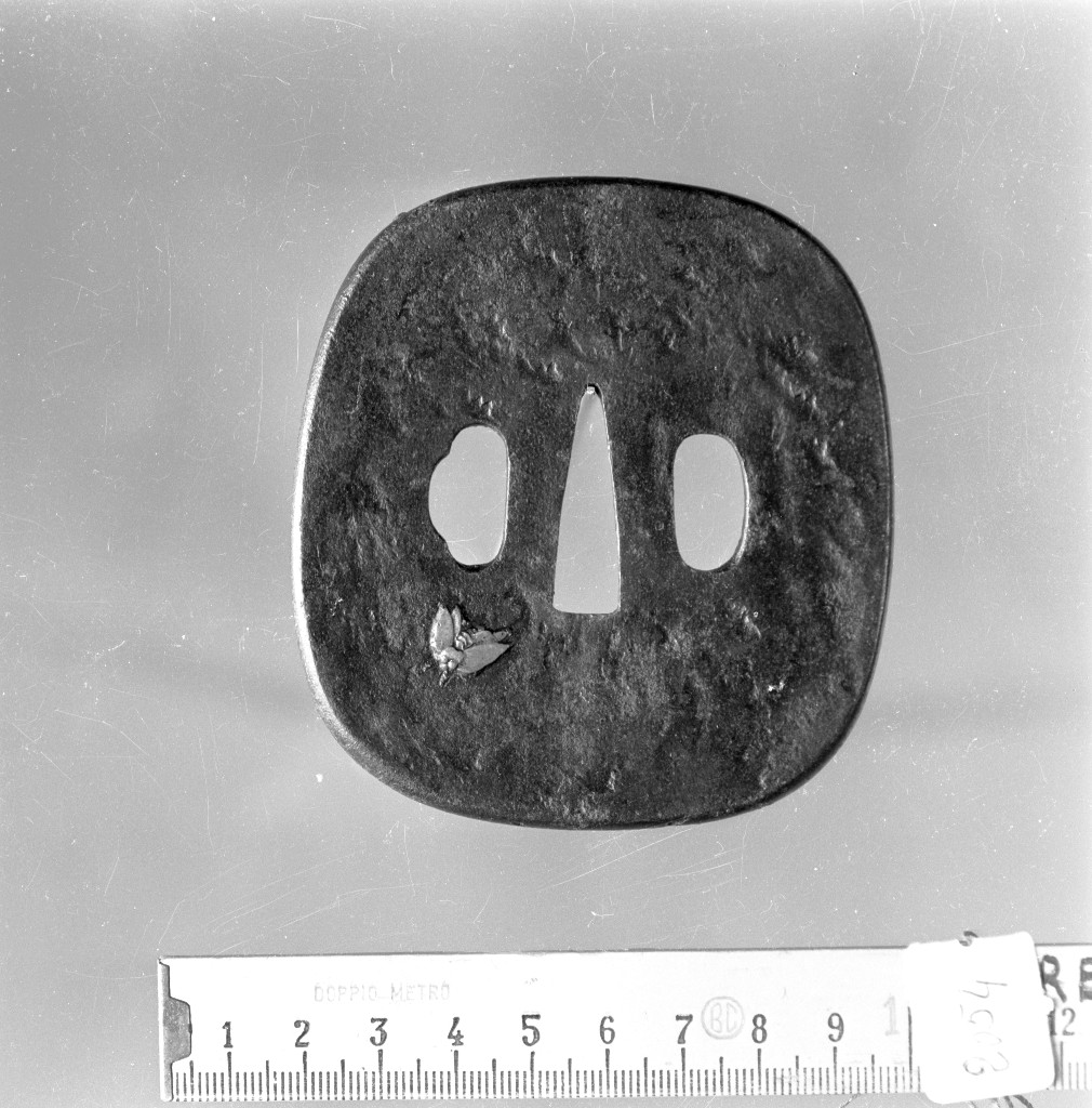 TSUBA DI FORMA NADE-KAKU. RYO-HITSU. LAVORAZIONE IN TAKA-BORI IROE-TAKA-ZOGAN. RAPPRESENTA SUL VERSO UNA PICCOLA FARFALLA, SUL RECTO ALTRE TRE FARFALLE