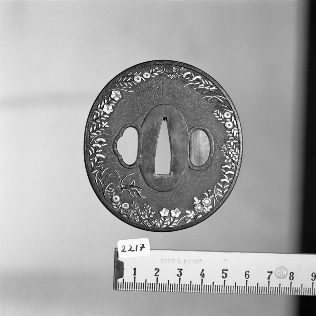 TSUBA IN SHAKUDO. RYO-HITSU PARZIALMENTE TAMPONATO. SFONDO IN NANAKO-JI REGOLARE CONCENTRICO. LAVORAZIONE IN TAKA-BORI IROE-TAKA-ZOGAN. PRESENTA UNA CORNICE DI FIORI E ERBE, CON ALCUNI GRILLI ALL'INTERNO