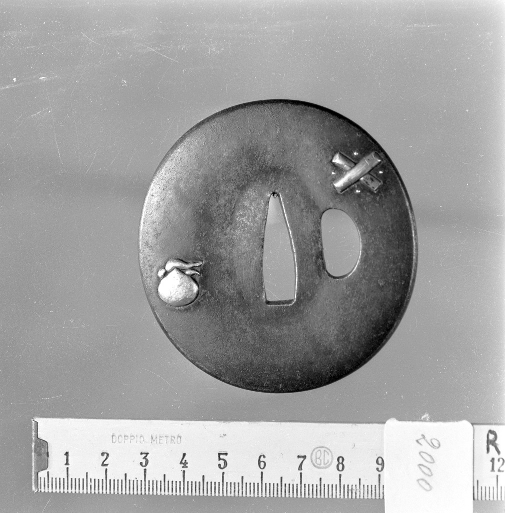 TSUBA DI FORMA OVALE. KATA-HITSU. LAVORAZIONE IN TAKA-BORI KIN-GIN-TAKA-ZOGAN. RAPPRESENTA SUL RECTO TRE, E SUL VERSO DUE DEGLI OTTO GIOIELLI SACRI